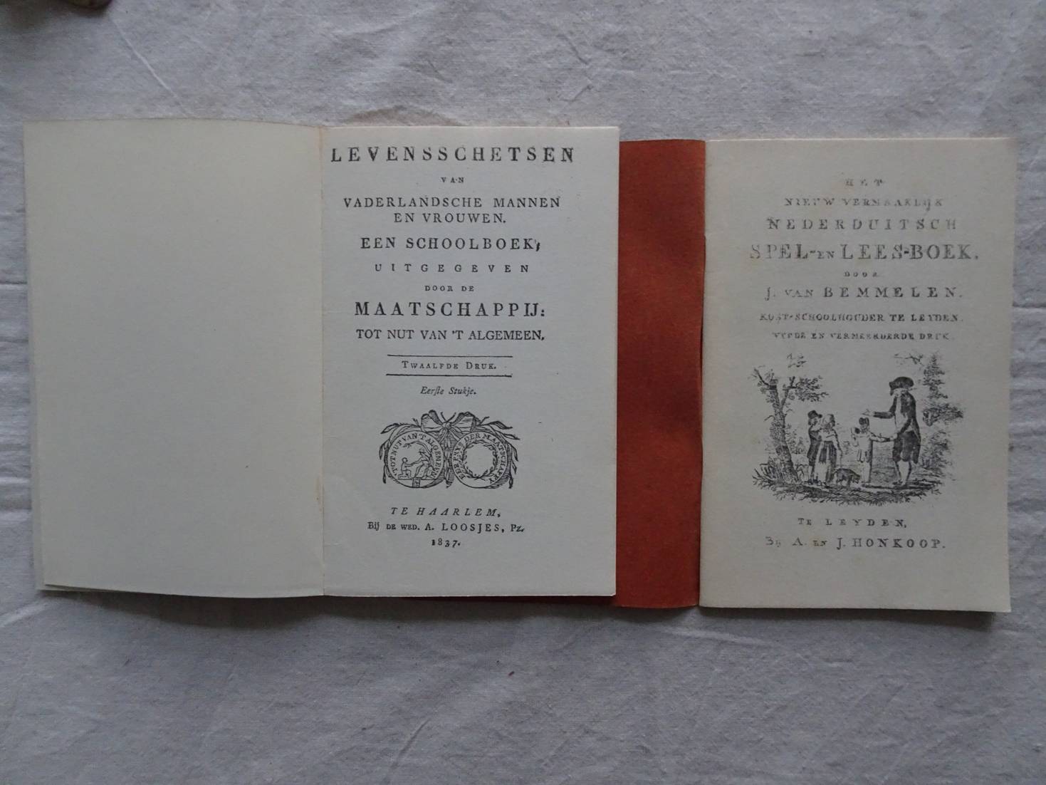Het nieuw vermaaklijk Nederduitsch spel- en lees-boek/ Levensschetsen van vaderlandsche mannen en vrouwen. Een schoolboek uitgegeven door de Maatschappij tot Nut van 't Algemeen. 2 titels.