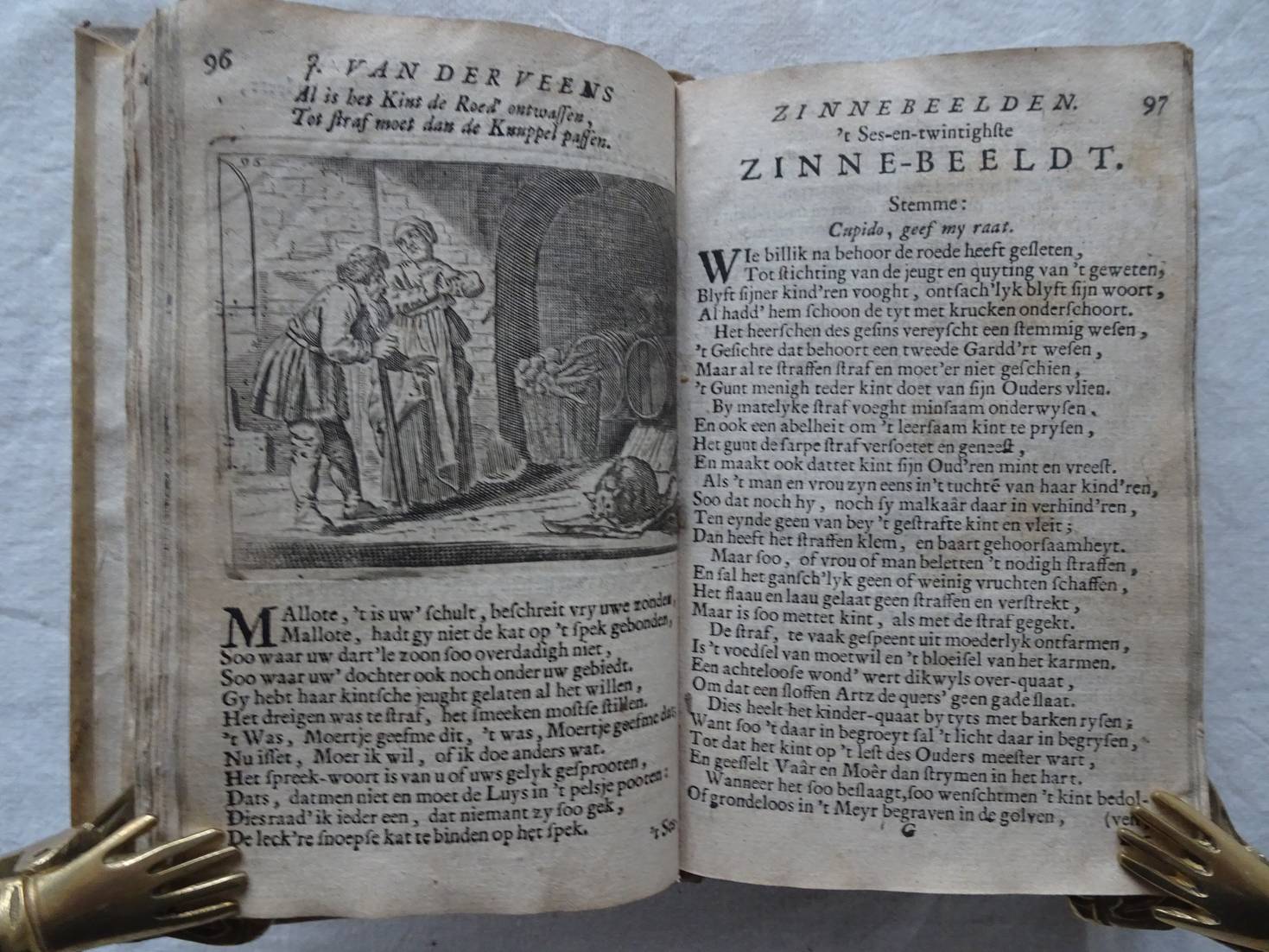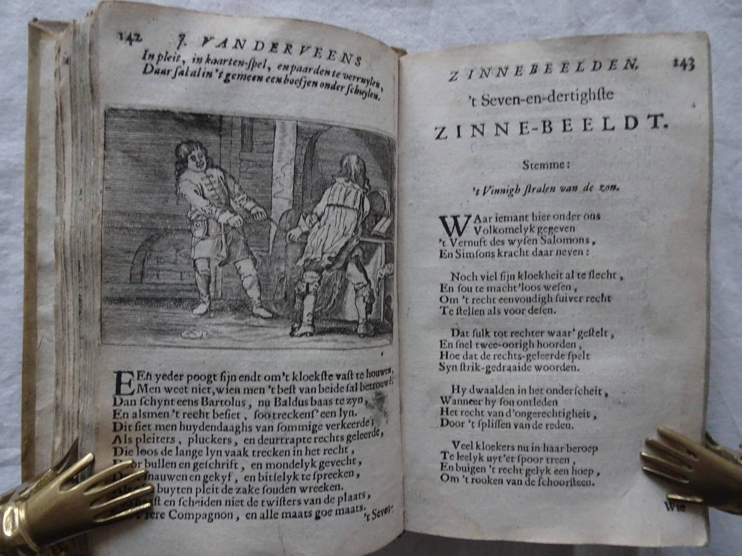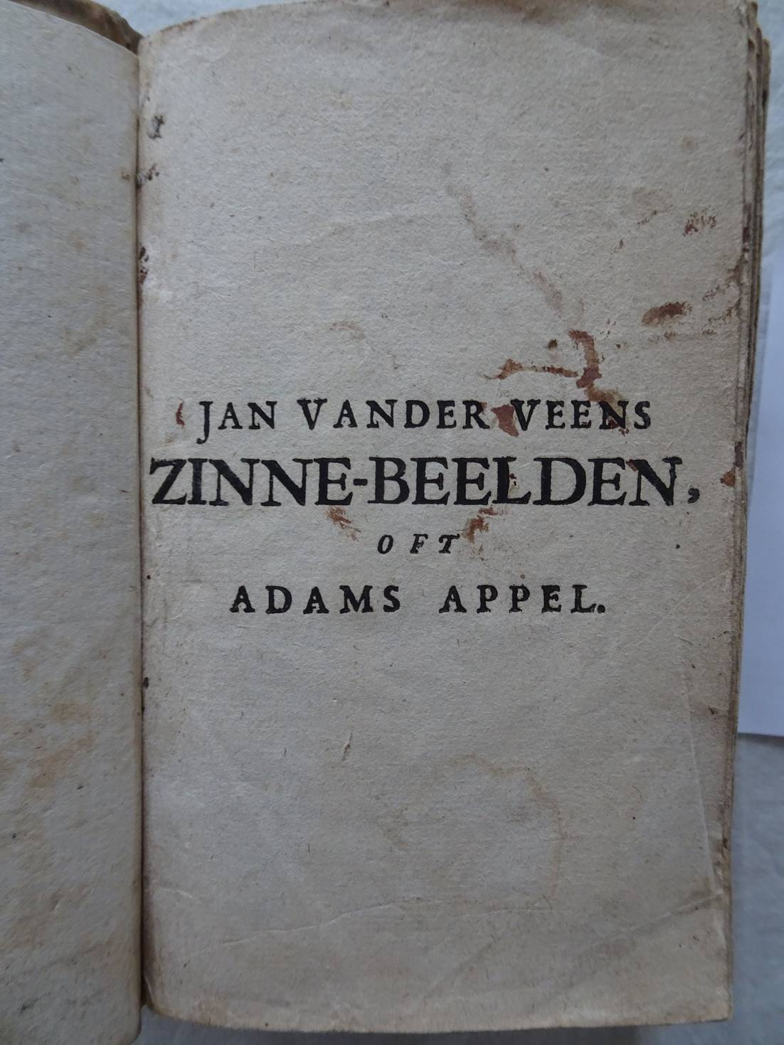 Jan vander Veens Zinne-beelden, oft Adams appel, Verciert met seer aardige konst-platen. Mitsgaders syne oude en nieuwe ongemeene bruylofs- en Zegezangen, Raatselen, uytgebeeldt met zin-ryke uytleggingen; syn gulden en yseren eeuw; alsmede een nikkers-praatje: Met een byvoegsel van verscheide gedichten; nooit voor deezen zoo gedrukt.