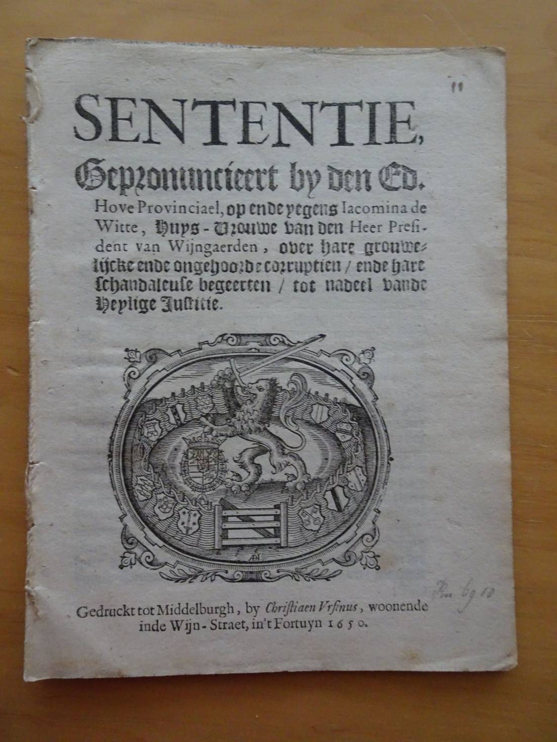 [38465]Sententie, Gepronuncieert by den Ed. Hove Provinciael, op ende yegens Iacomina de Witte, Huys-Vrouwe van den Heer President van Wijngaerden, over hare grouwelijcke ende ongehoorde corruptien/ ende hare schandaleuse begeerten/ tot nadeel vande Heylige Justitie. Middelburg; 1650; Christiaen Ursinus; [13 p.]
