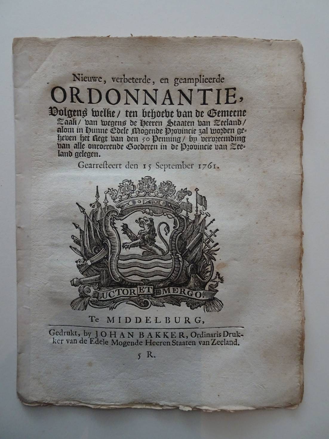 Nieuwe, verbeterde, en geamplieerde Ordonnantie, Volgens welke/ ten behoeve van de Gemeene Zaak/ van wegens de Heeren Staaten van Zeeland/ alom in Hunne Edele Mogende Provincie zal worden geheven het Regt van den 50 Penning/ by vervreemding van alle onroerende Goederen in de Provincie van Zeeland gelegen. Gearresteert den 15 September 1761. Middelburg; 1761; Johan Bakker; 16 p. [1472]