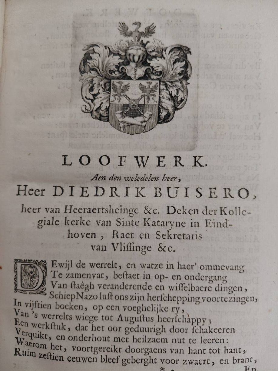 Amsterdam; 1671; Voor de weduwe van Abraham de Wees. Engraved frontispiece; engraved coat of arms of Diedrik Buisero and 15 engravings at the beginning of the chapters. Decorated blindstamped vellum with raised bands; (24), 499; (13) pp