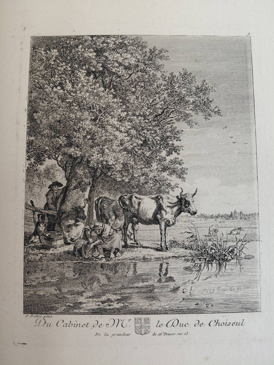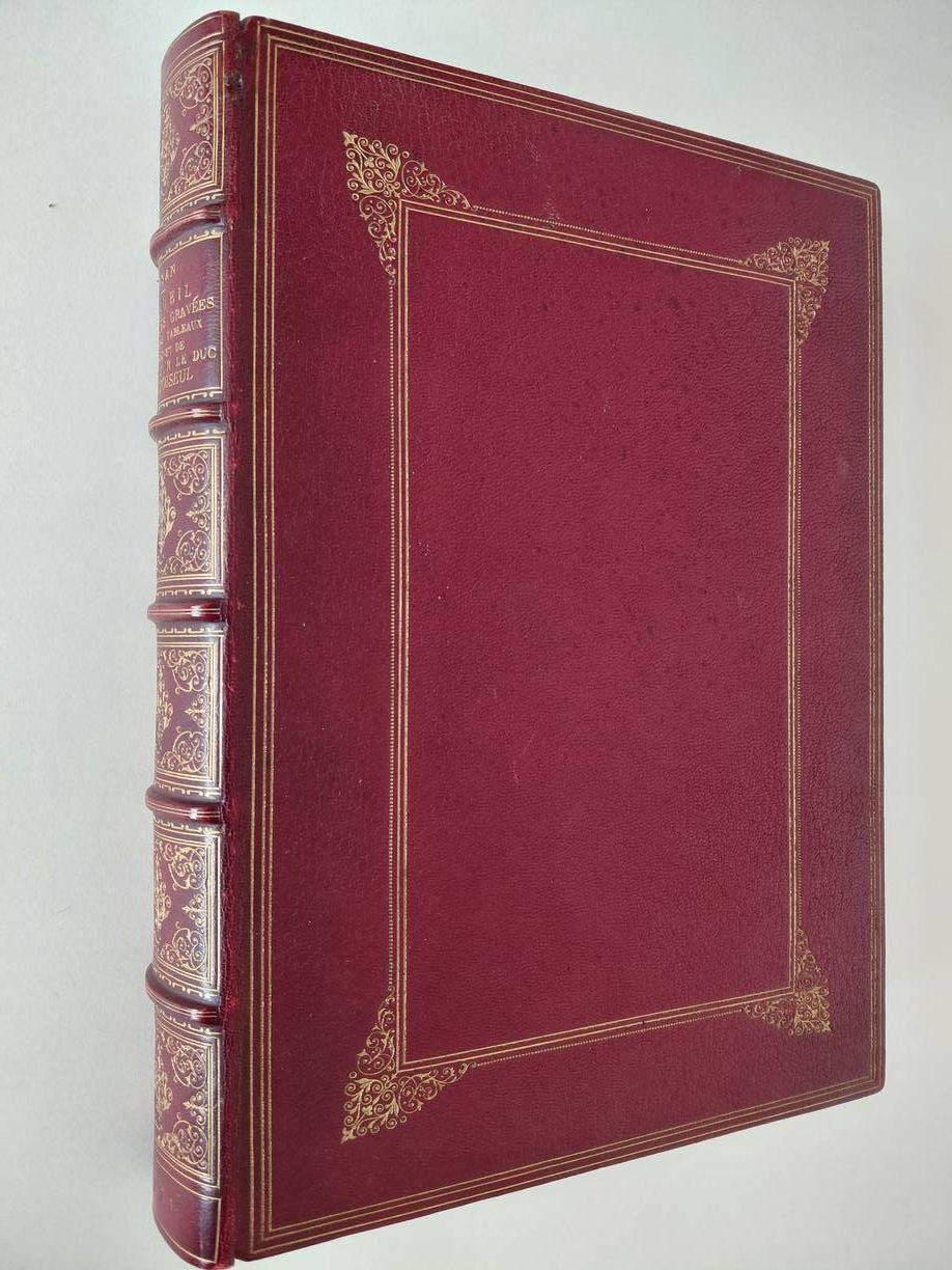 Paris; 1771. Luxury edition op large paper. First edition. Gilt decorated contemporary red leather with raised bands; gilt edges. Large octavo (33x25 cm). Engraved title; 12 pages of text, portrait of Duc de Choiseul and 128 finely engraved plates numbered 1-123, plate 47 numbered twice, also the plates -68, 69, 76, 78, and 101. The Duke of Choiseul's cabinet contained paintings by Flemish and Dutch masters such as Rembrandt, Breughel, Ruysdael, Potter, Van Dyck, Rubens, A. van de Velde, Van Ostade, Titian, Le Nain, Robert, Vander Heyden etc.