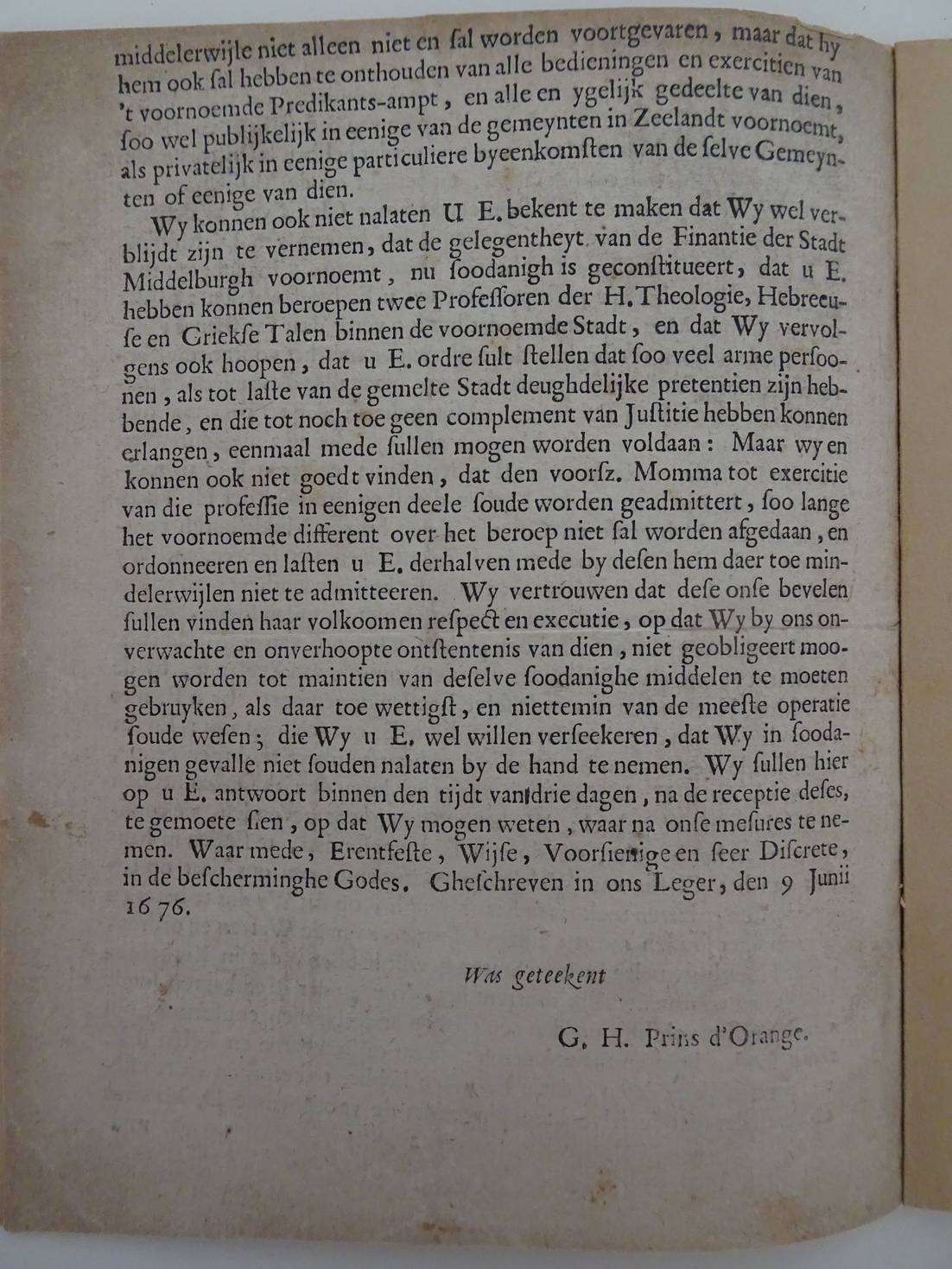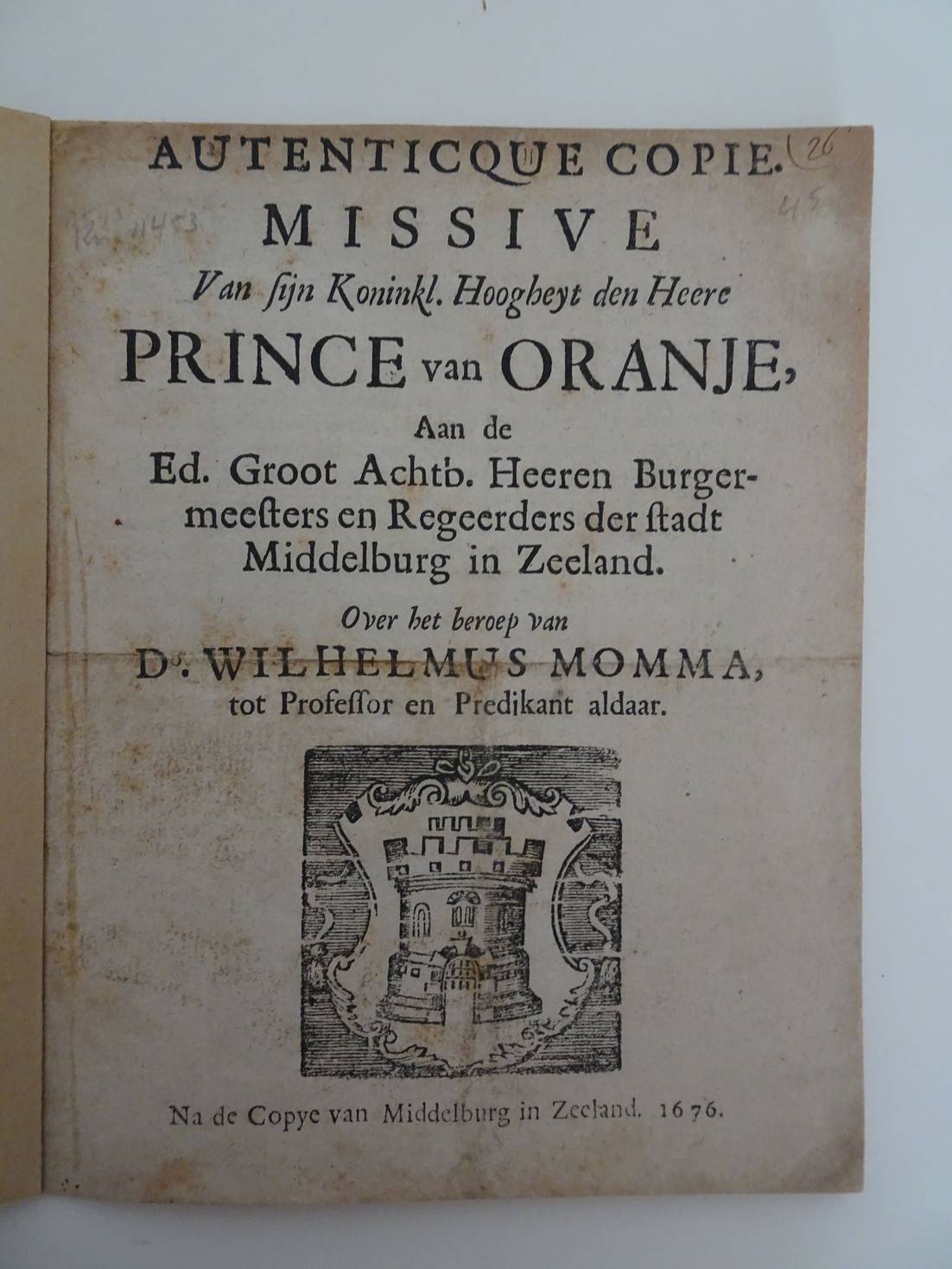 [38870]Willem III, koning-stadhouder Autenticque copie. Missive Van ... den Heere Prince van Oranje, Aan de ... Burgermeesters en Regeerders der stadt Middelburg in Zeeland. Over het beroep van D°. Wilhelmus Momma, tot Professor en Predikant aldaar. Na de Copye van Middelburg; 1676; z.n.; [4 p.] Knuttel 11453 [1115]