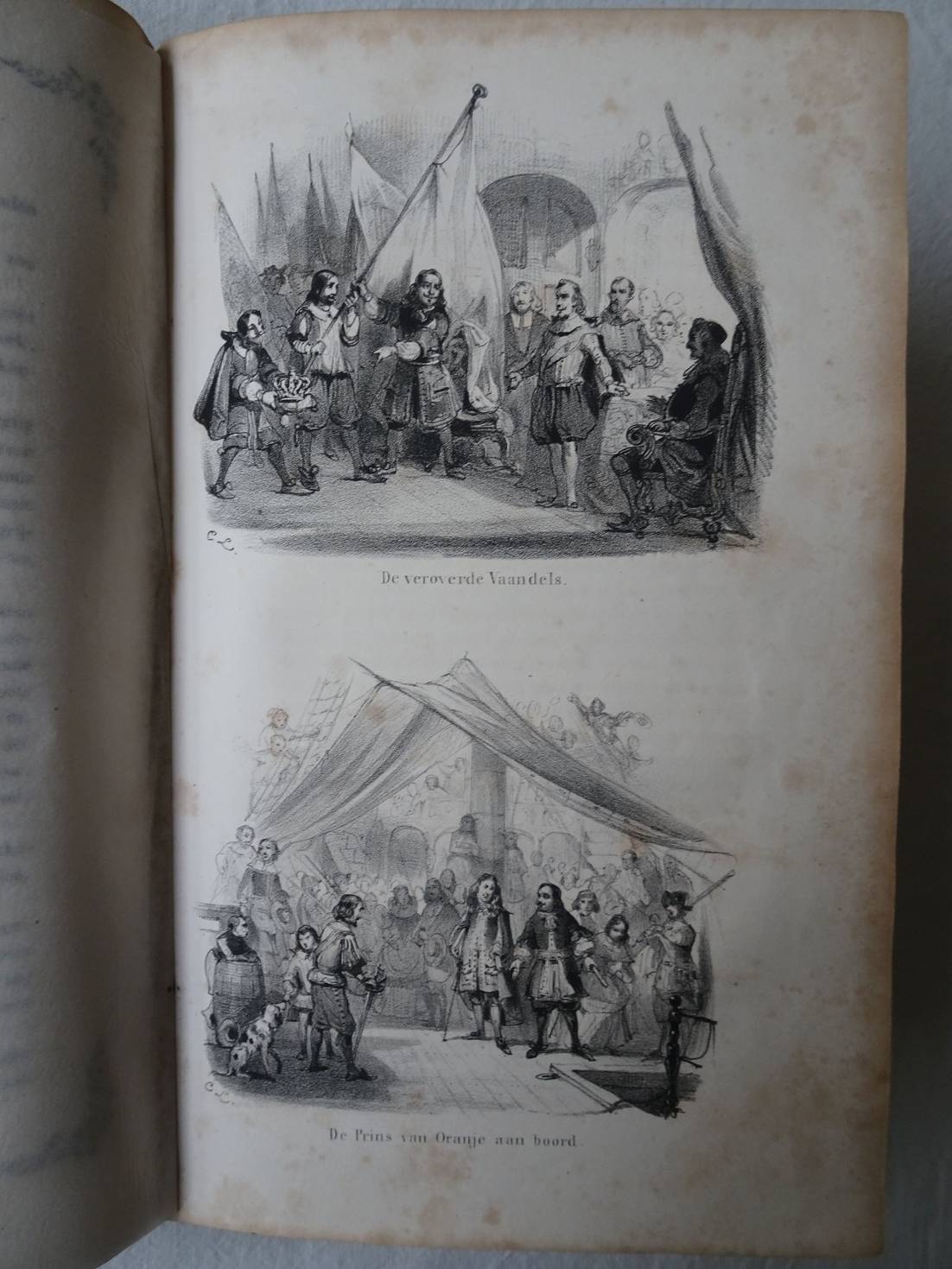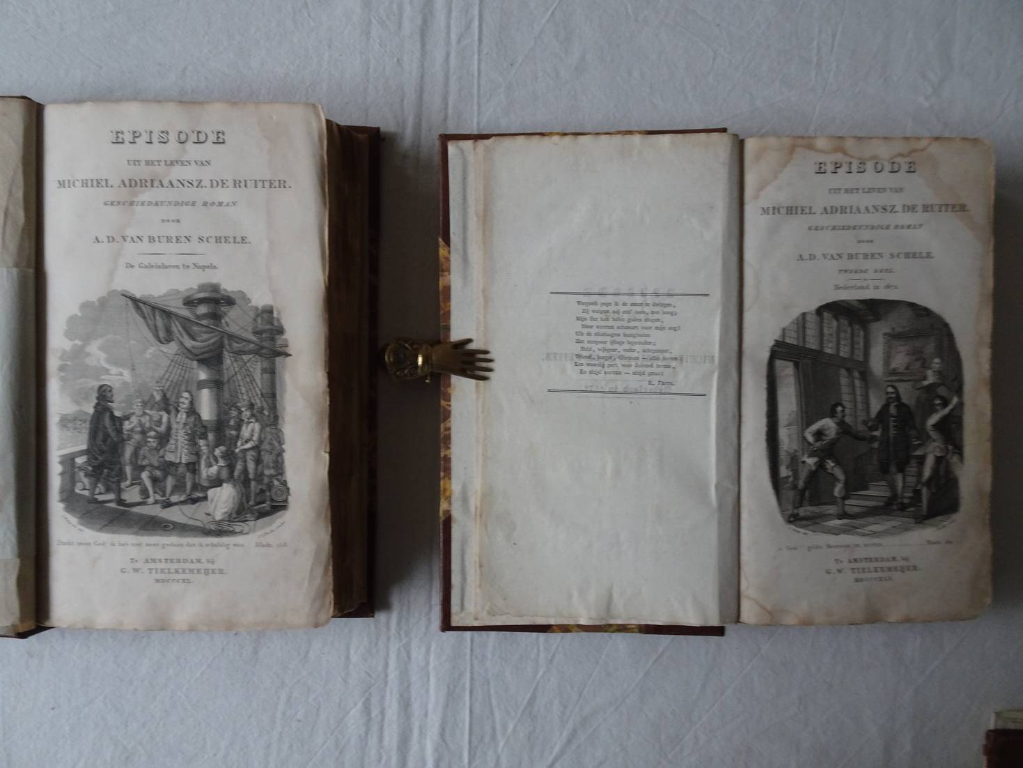 Lennep, J. van De twee admiralen. Kornelia Vossius. Een schaking in de 17e eeuw. Rotterdam; 1859; M. Wijt & Zonen; Romantische Werken no. XIV; 2 ill. van J.C. d'A. Gerkens en D.J. Sluyter; in linnen, goudgestempeld; 321 p. De eerste novelle over De Ruyter. Een katern enigszins los in de band. Enkele vlekjes in de marges van de eerste 15 blz. [40]