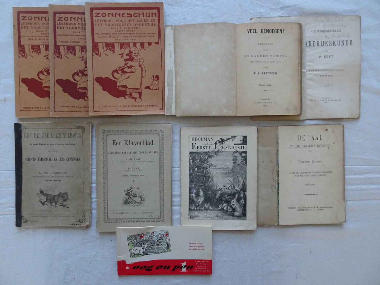 Eerste leesboekje. Oefeningen/ Een Klaverblad. Leeslesjes met plaatjes voor de kleinen/ De taal op de lagere school. Tweede stukje. Van een heel stel taaloefeningen, methodisch gerangschikt, om de taal zuiver te leeren schrijven/ Veel genoegen! Leesboek voor de lagere school/ Grondbeginselen der Aardrijkskunde/ Oog en pen. 20 verhaaltjes voor het spreek- en stelonderwijs/ Het eerste leesonderwijs in zeven stukjes en eene uitvoerige handleiding bevattende gehoor- uitspraak- en leesoefeningen. Derde stukje/ Zonneschijn. Leesboek voor het lager en het voortgezet onderwijs. Derde, vierde en vijfde stukje. In totaal 10 titels.