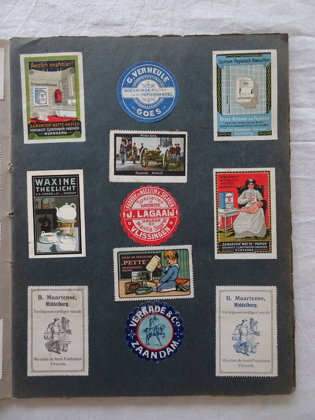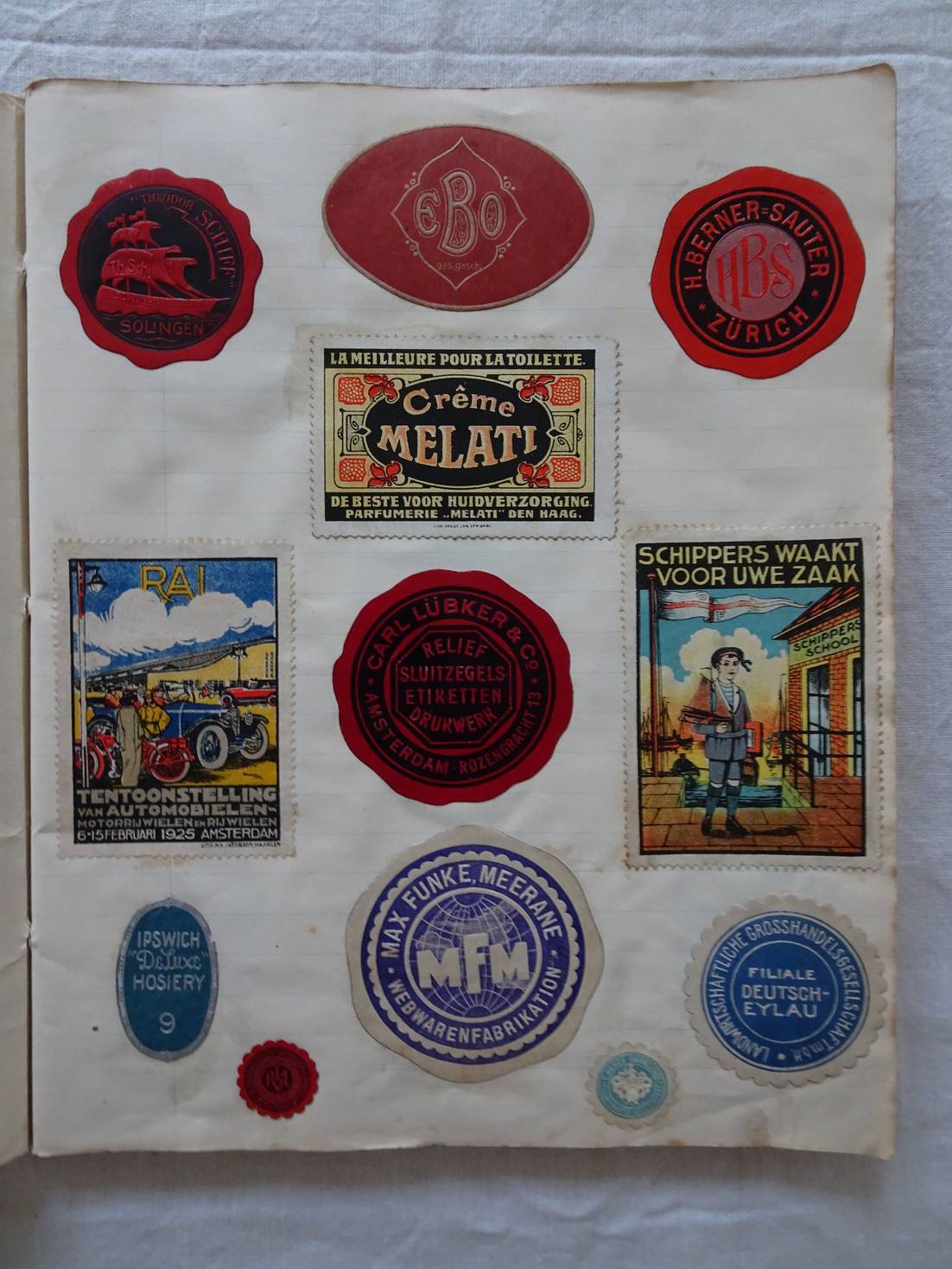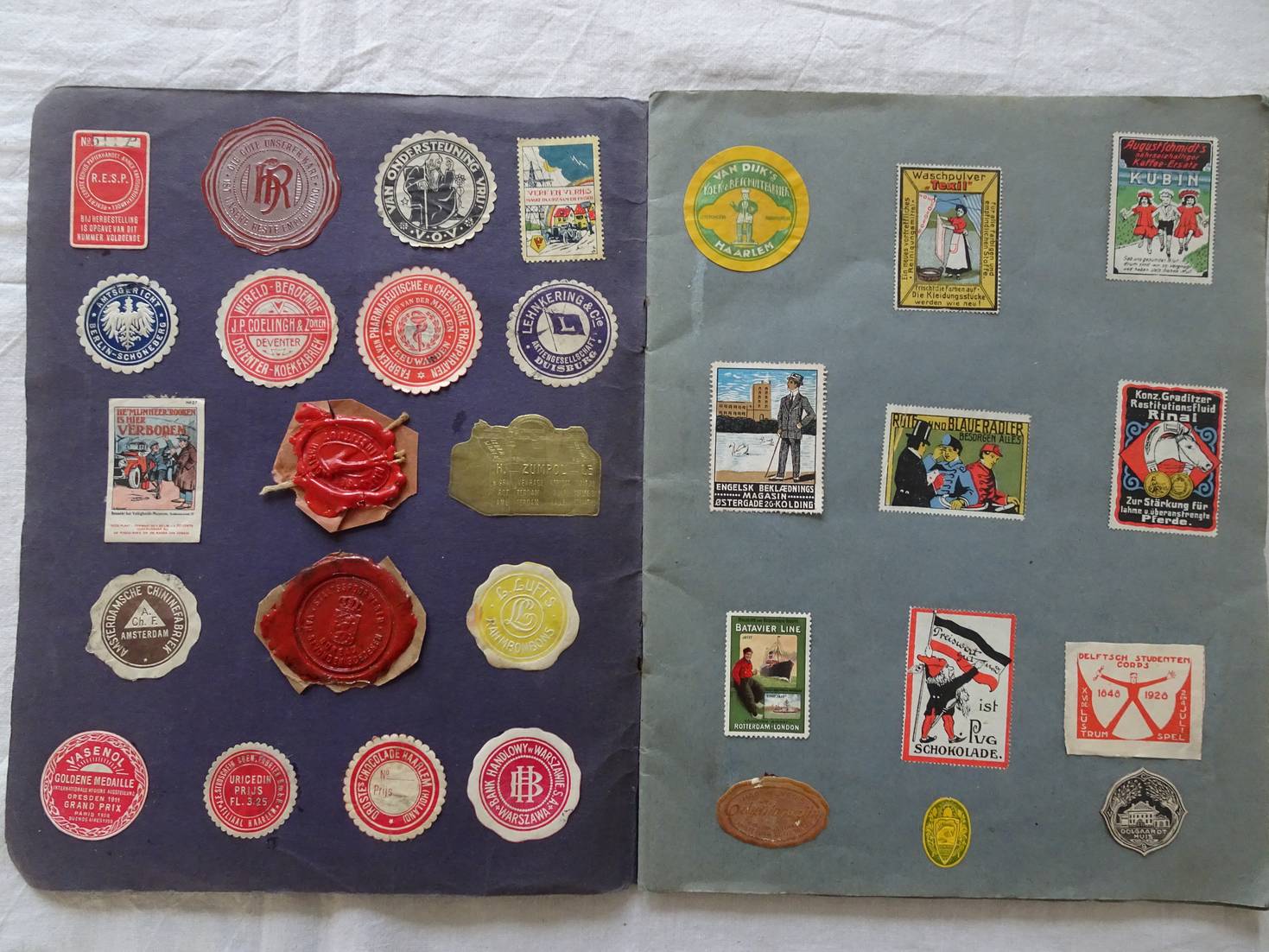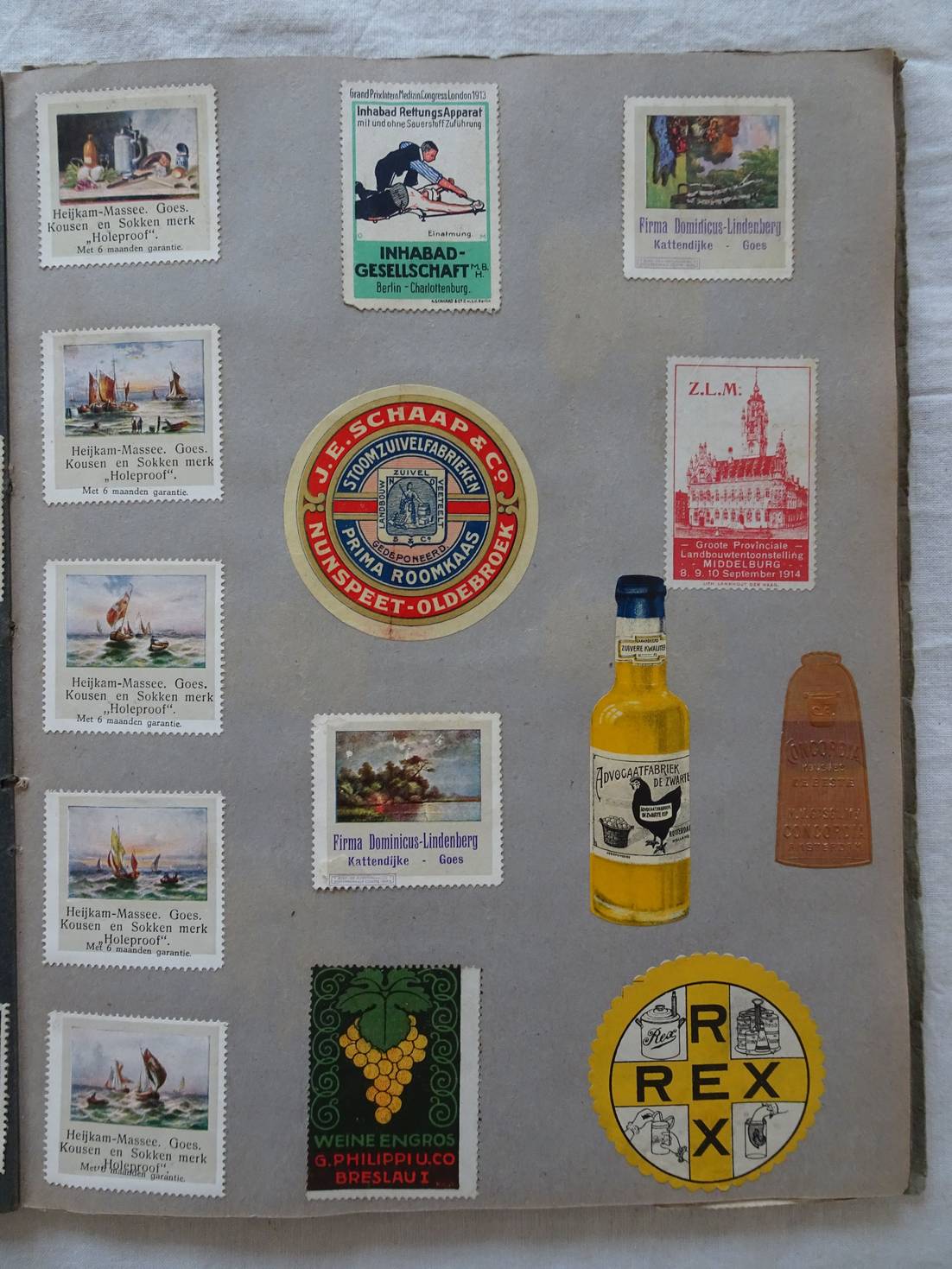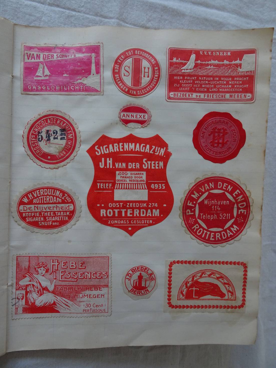 20 Pagina's beplakt met ca. 230 sluitzegels. Het album heeft een stempel van Boekhandel Erven M.D. Dekker Jr. Goes.Zegels dateren van ca. 1910-1925. Geven een fraai beeld weer van toenmalige bedrijven en de manier van reclame maken.