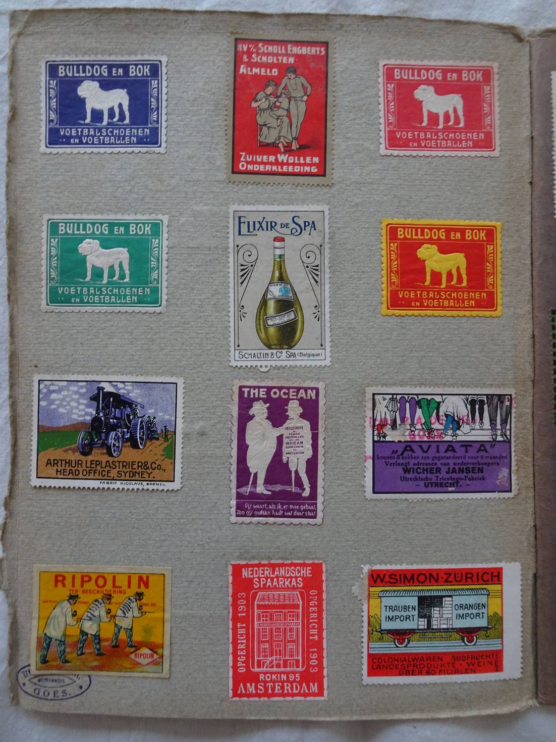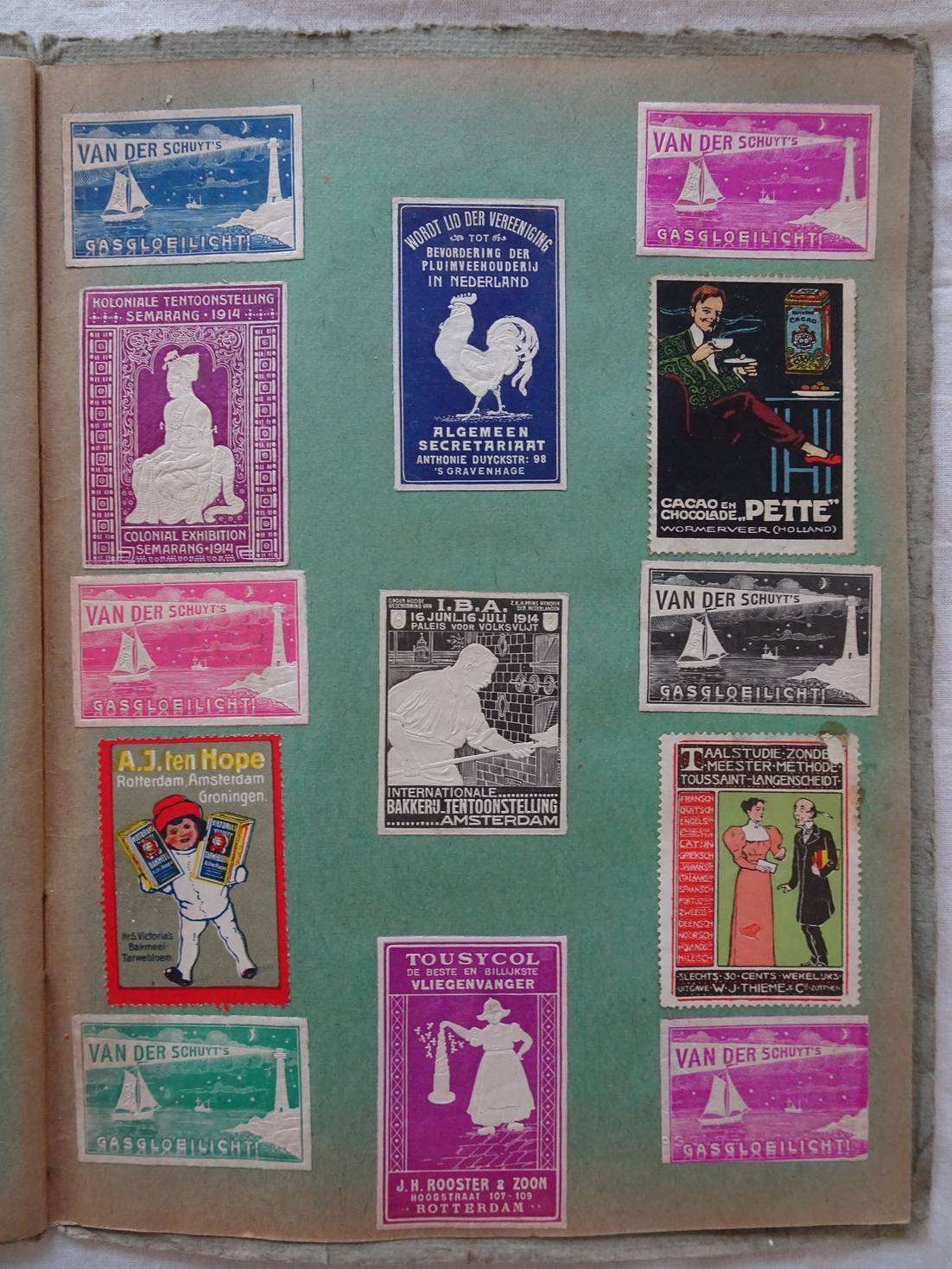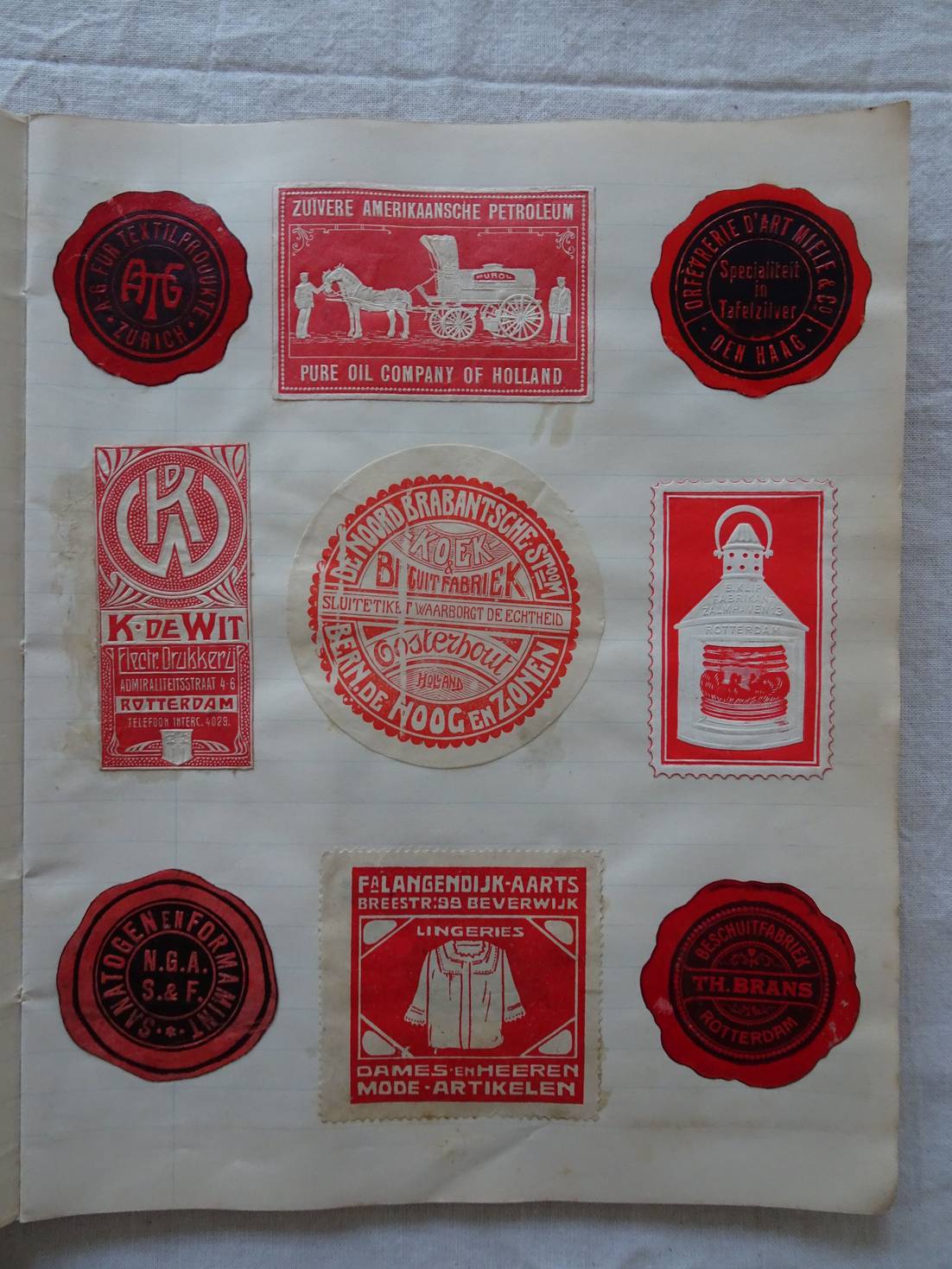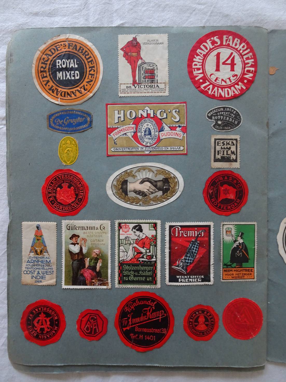 20 Pagina's beplakt met ca. 230 sluitzegels. Het album heeft een stempel van Boekhandel Erven M.D. Dekker Jr. Goes.Zegels dateren van ca. 1910-1925. Geven een fraai beeld weer van toenmalige bedrijven en de manier van reclame maken.
