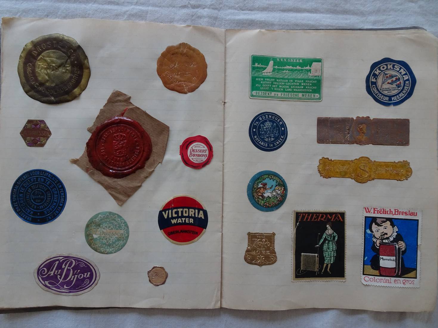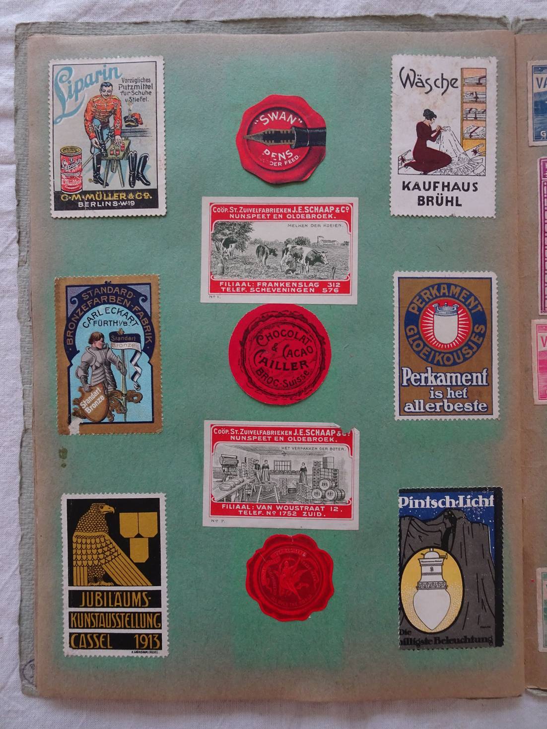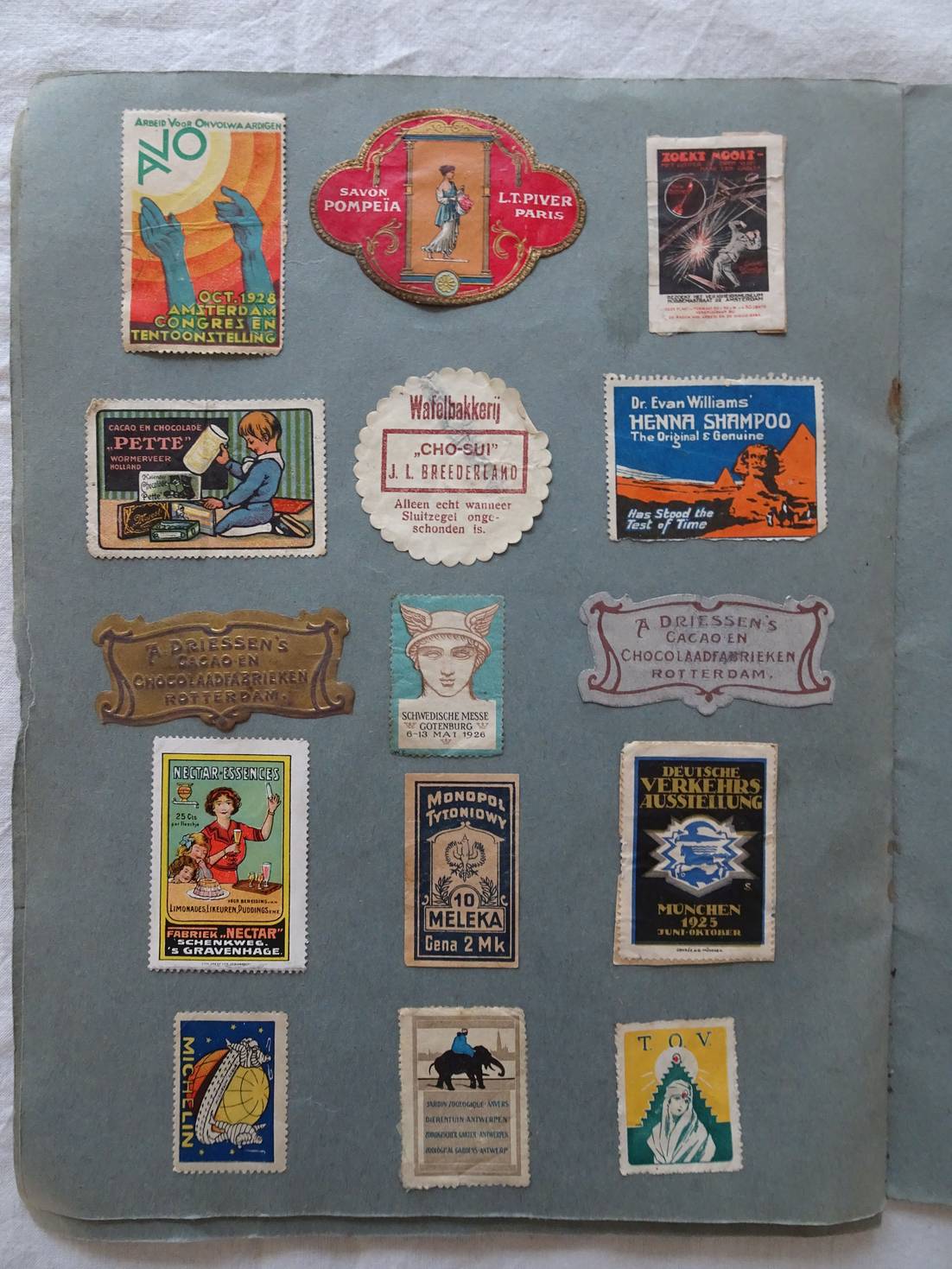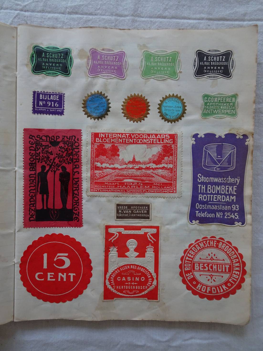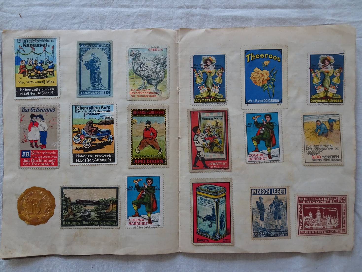 20 Pagina's beplakt met ca. 230 sluitzegels. Het album heeft een stempel van Boekhandel Erven M.D. Dekker Jr. Goes.Zegels dateren van ca. 1910-1925. Geven een fraai beeld weer van toenmalige bedrijven en de manier van reclame maken.