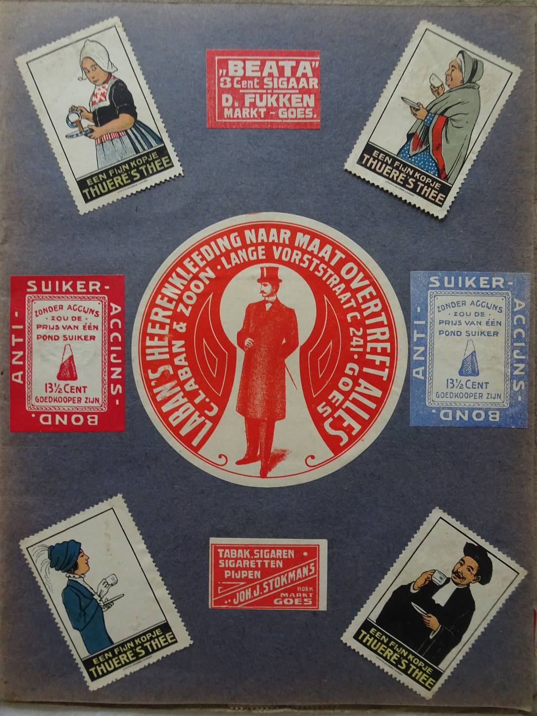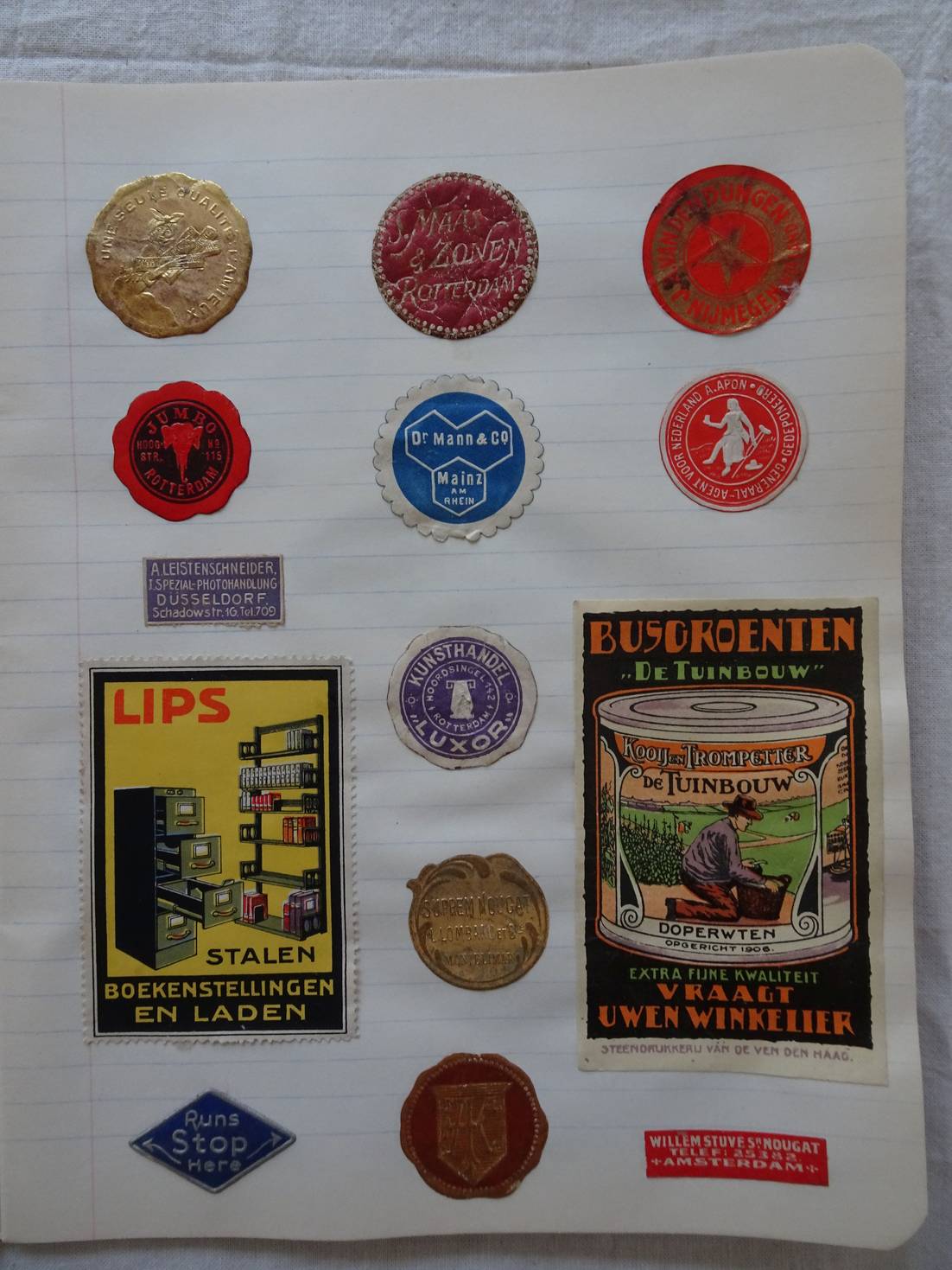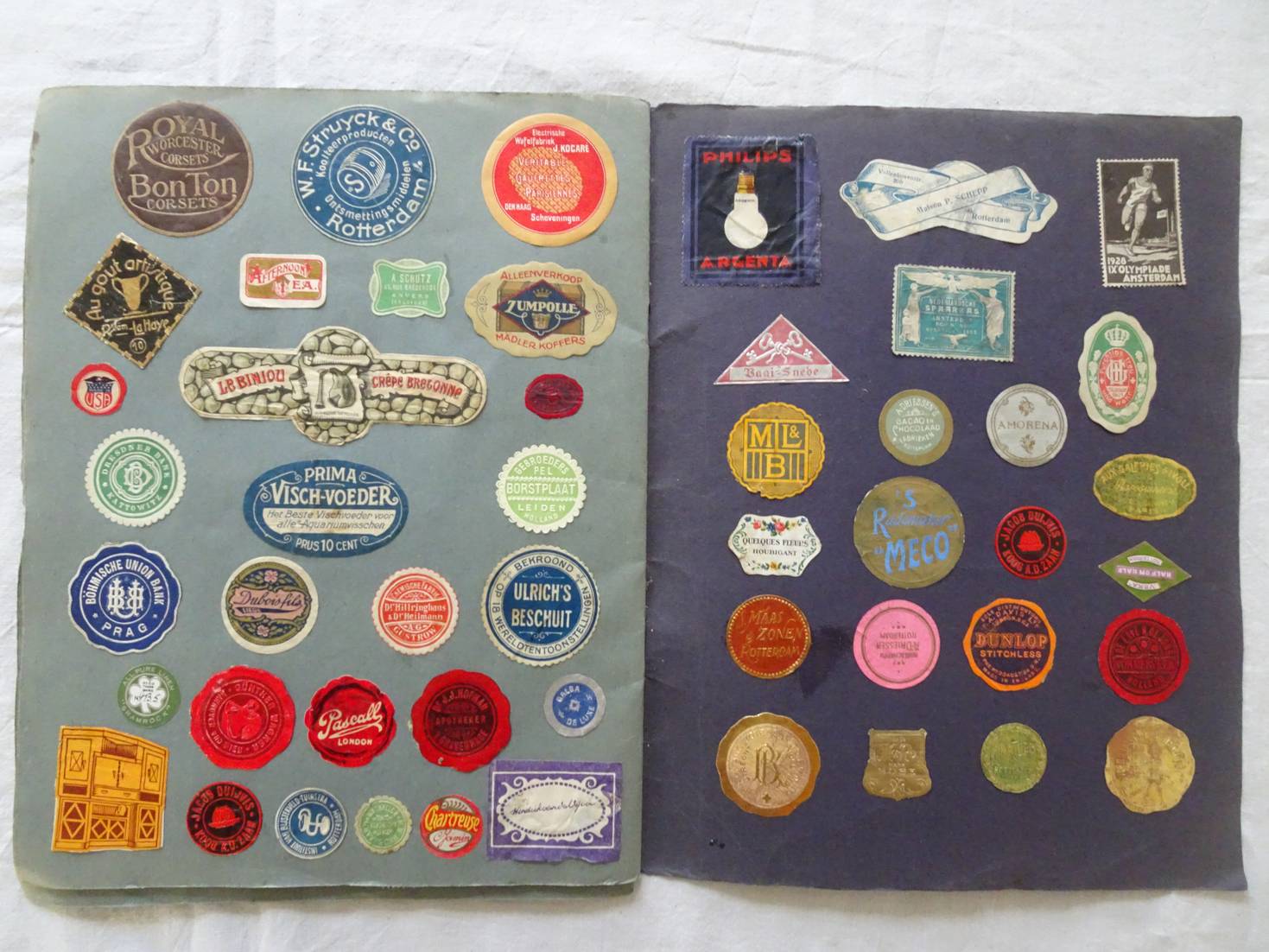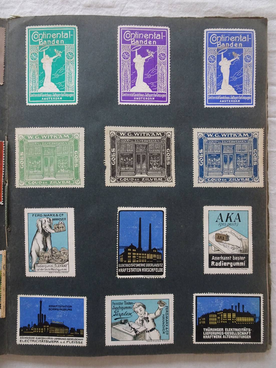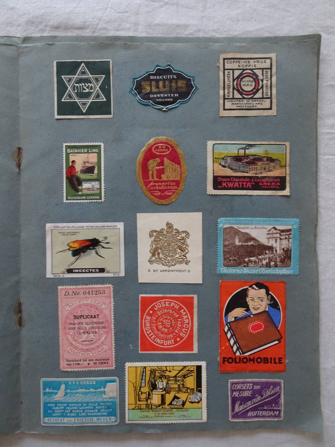 20 Pagina's beplakt met ca. 230 sluitzegels. Het album heeft een stempel van Boekhandel Erven M.D. Dekker Jr. Goes.Zegels dateren van ca. 1910-1925. Geven een fraai beeld weer van toenmalige bedrijven en de manier van reclame maken.