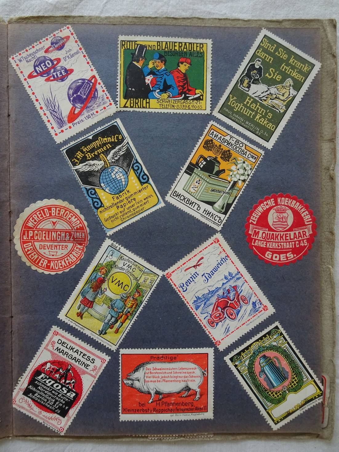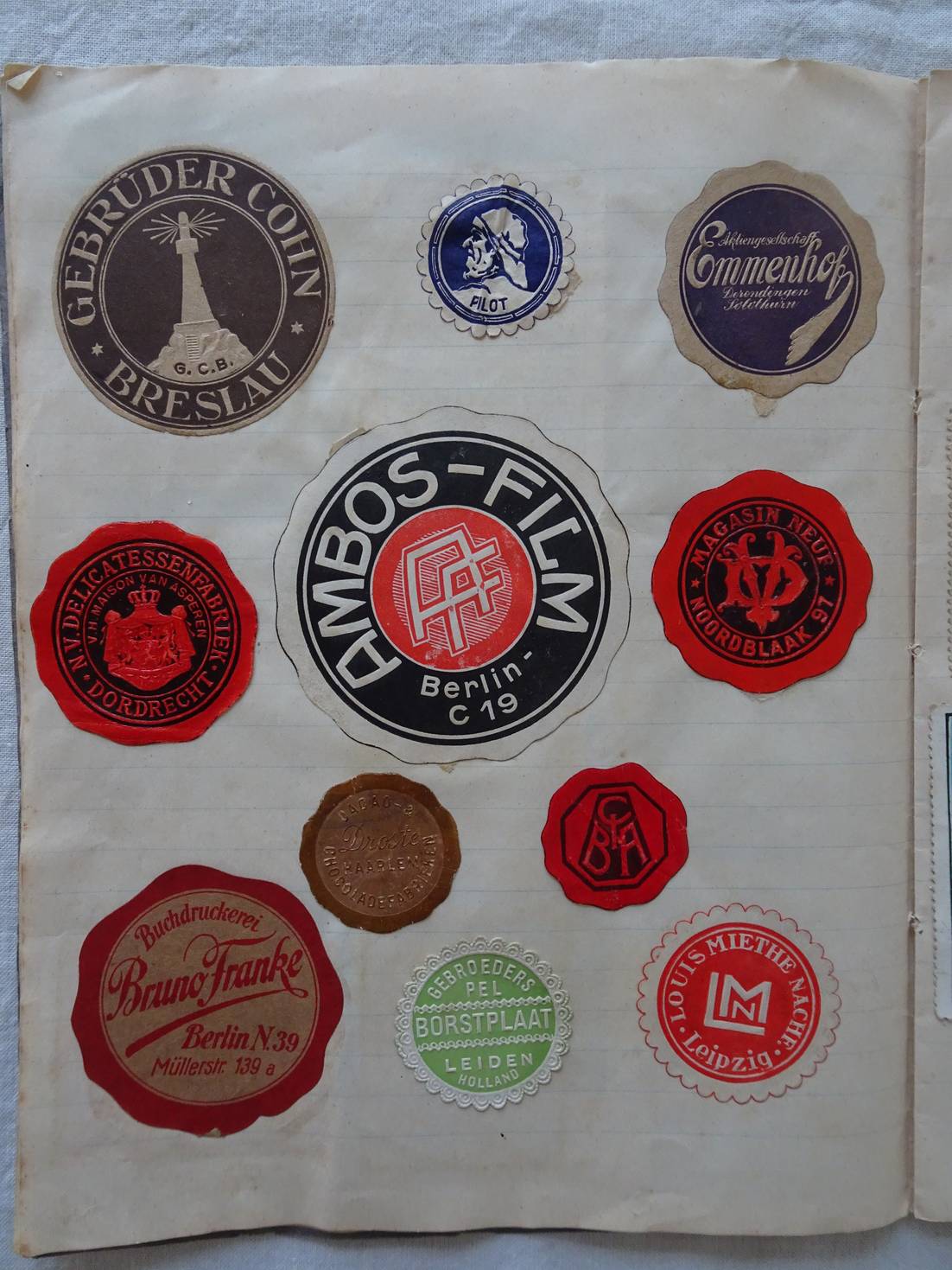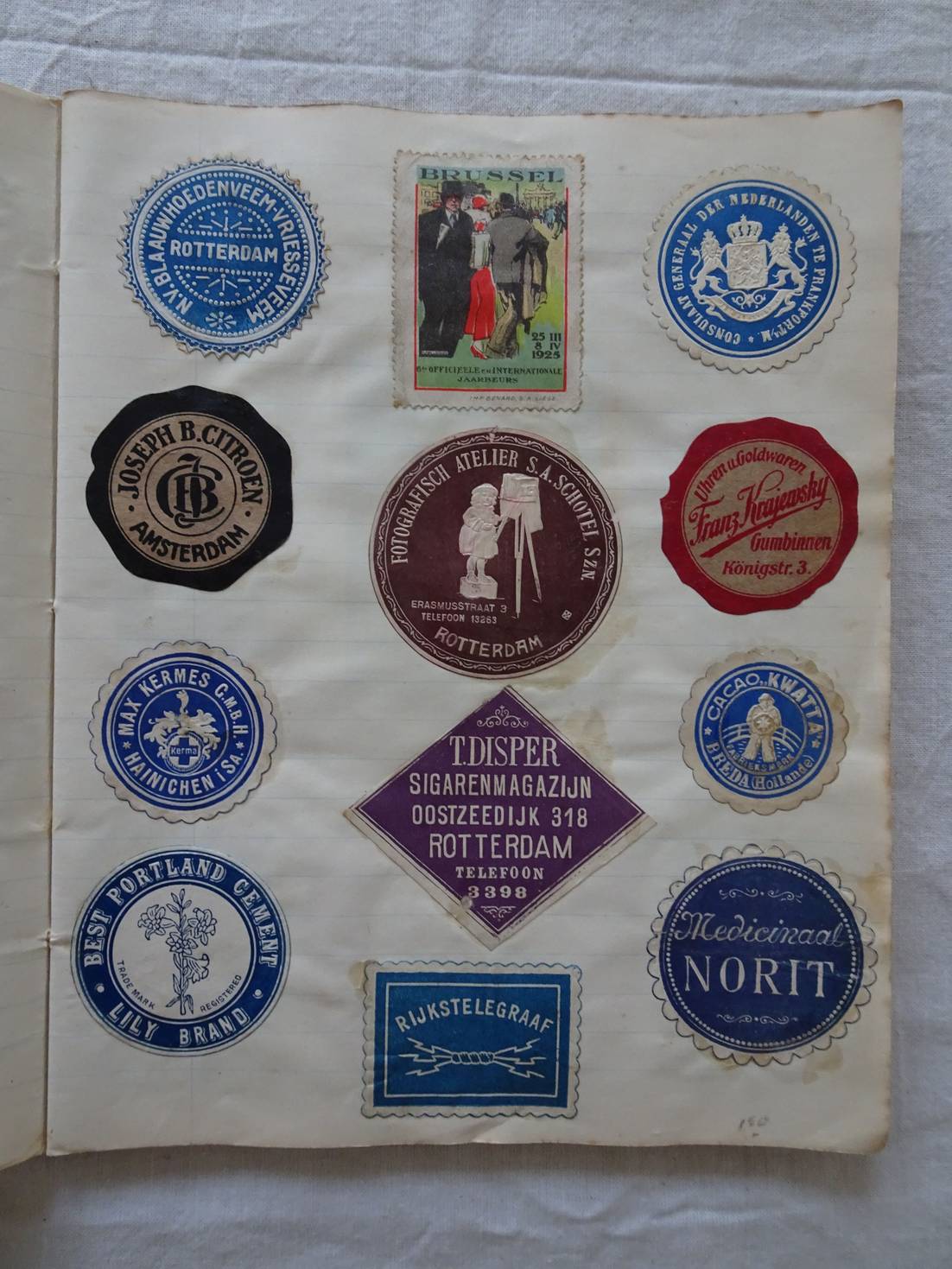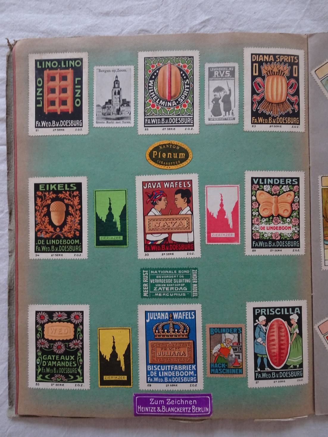 20 Pagina's beplakt met ca. 230 sluitzegels. Het album heeft een stempel van Boekhandel Erven M.D. Dekker Jr. Goes.Zegels dateren van ca. 1910-1925. Geven een fraai beeld weer van toenmalige bedrijven en de manier van reclame maken.