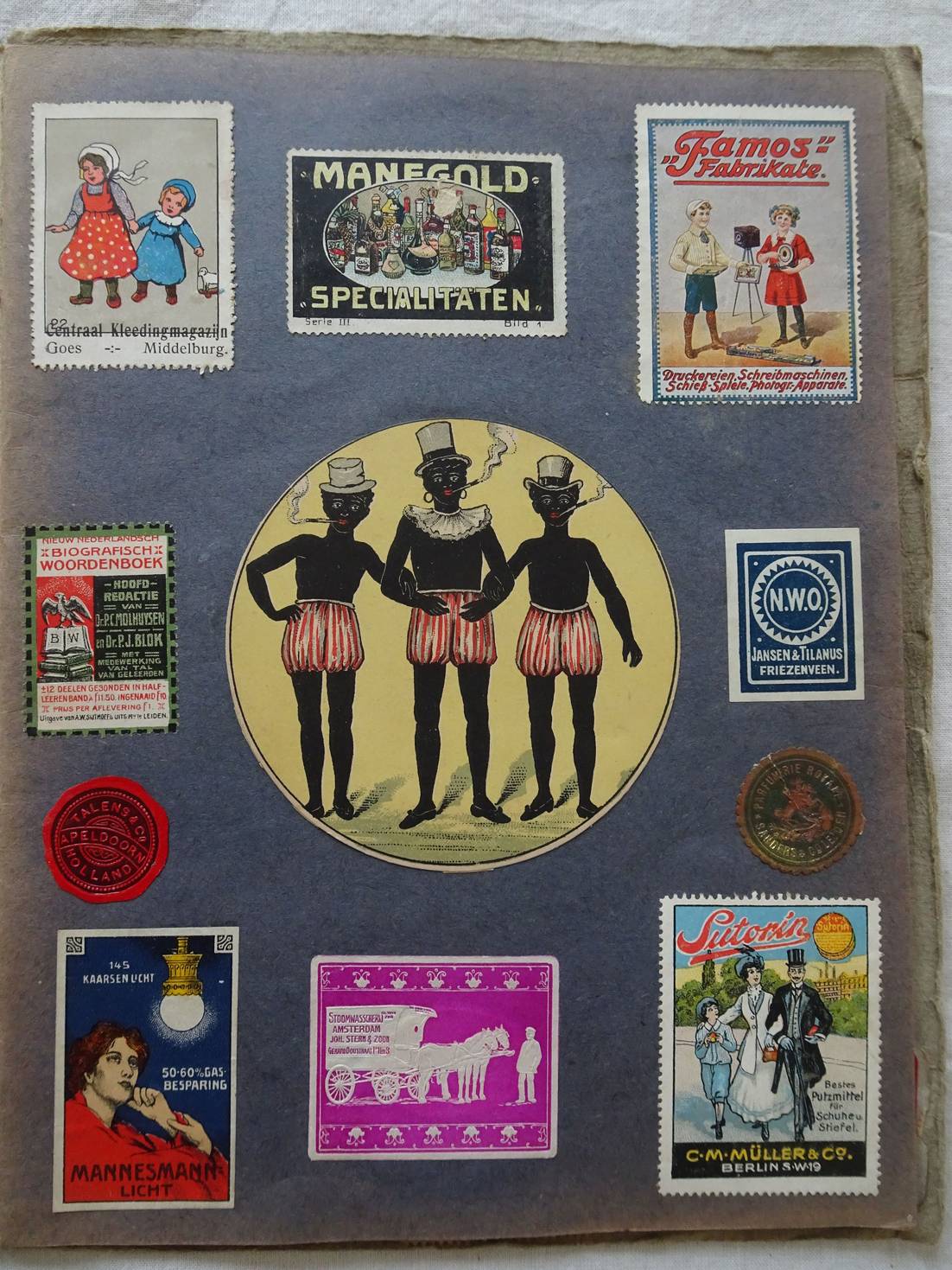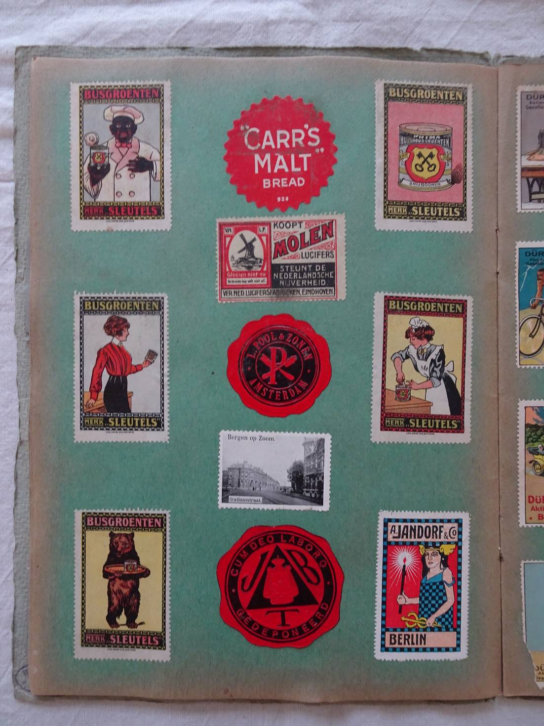 20 Pagina's beplakt met ca. 235 sluitzegels. Het album heeft een stempel van Boekhandel Erven M.D. Dekker Jr. Goes.Zegels dateren van ca. 1910-1925. Geven een fraai beeld weer van toenmalige bedrijven en de manier van reclame maken.