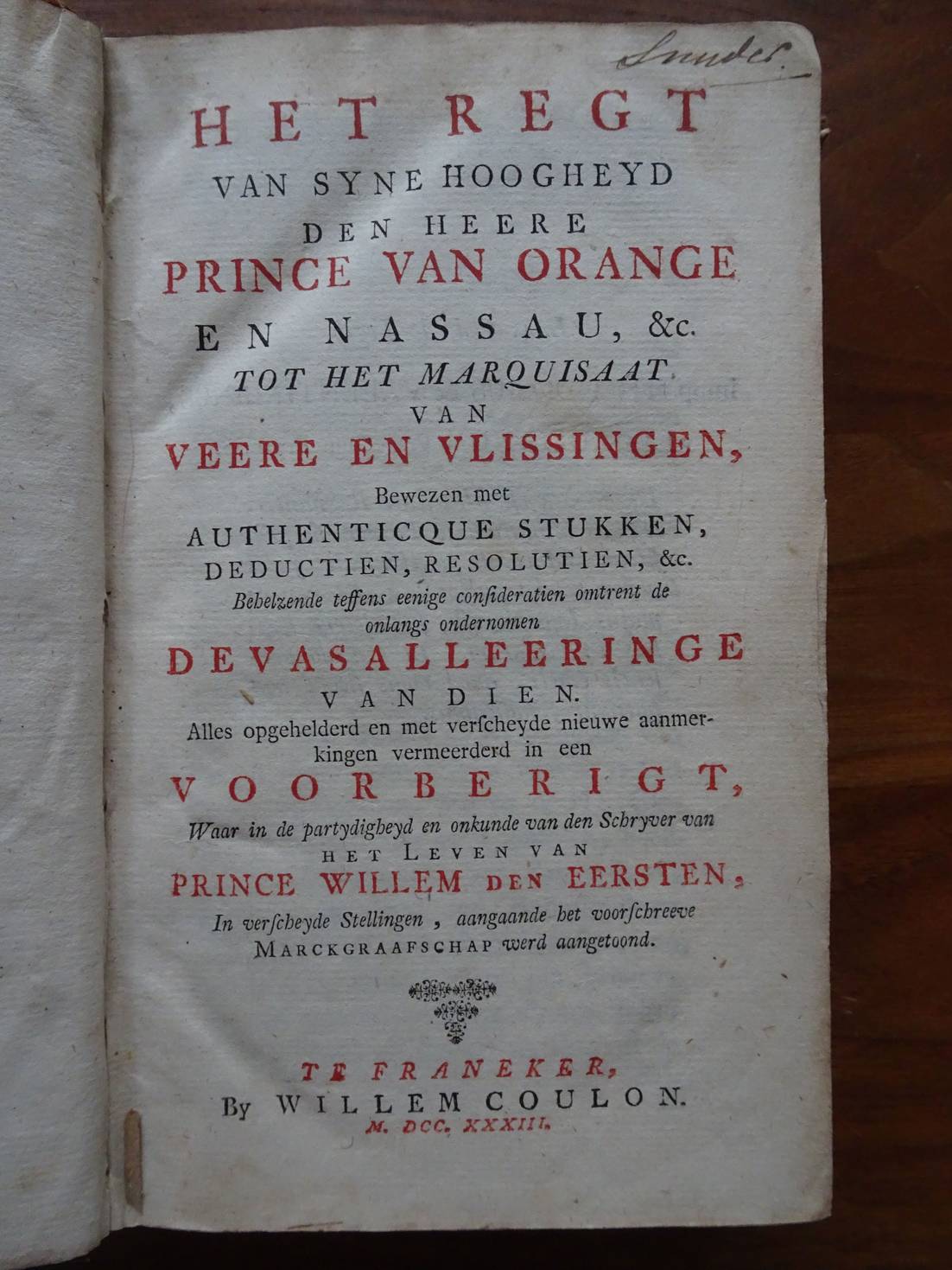 Het regt van syne Hoogheyd den Heere Prince van Orange en Nassau, &c. tot het Marquisaat van Veere en Vlissingen, bewezen met authenticque stukken, deductien, resolutien, &c. : behelzende teffens eenige consideratien omtrent de onlangs ondernomen Devasalleeringe vandien.