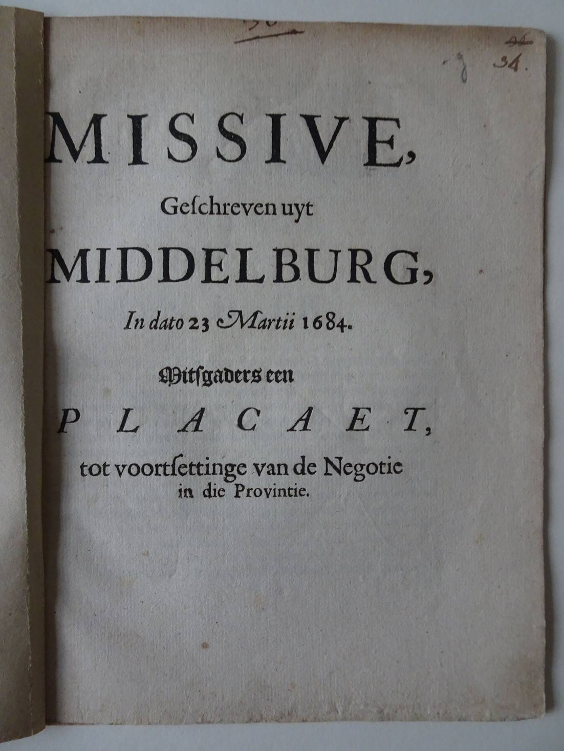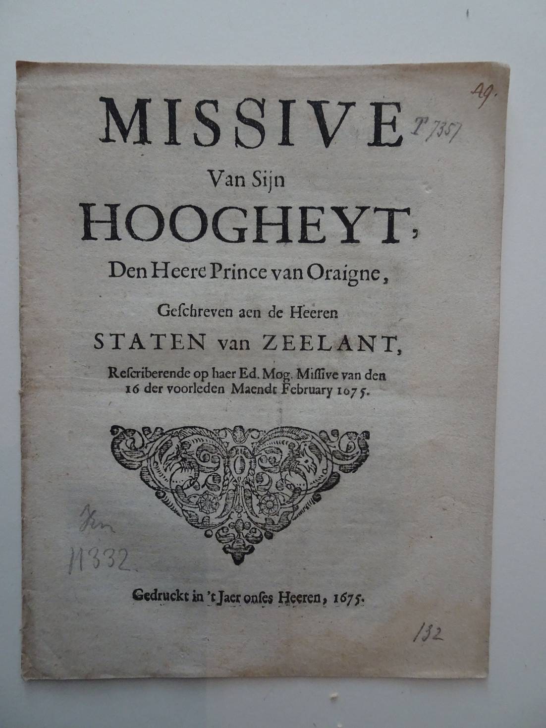 Missive Van Sijn Hoogheyt, D'Heere Prince van Orangie, Geschreven aen de Heeren Staten van Zeelant, Rescriberende op haer Ed. Mog. Misive van den16 der voorleden Maendt February 1675