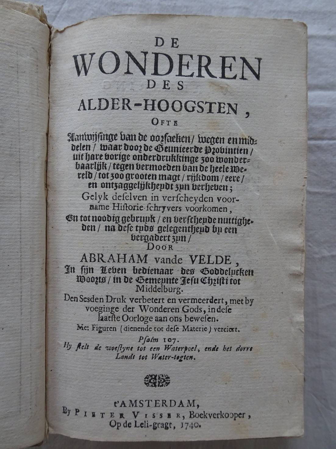 De wonderen des Alder-hoogsten, ofte Aanwijsinge van de oorsaeken, wegen en middelen, waar door de Geunieerde Provintien, uit hare vorige onderdrukkinge zoo wonderbaarlijk, tegen vermoeden van de heele wereld, tot zoo grooten magt, rijkdom, eere en ontzaggelijkheydt zyn verheven; gelyk deselven in verscheyden voorname historie-schryvers voorkomen, en tot noodig gebruyk ... Den sesden druk verbetert en vermeerdert, met by voeginge der wonderen Gods, in dese laatste oorloge aan ons bewesen. Met figuren verciert.