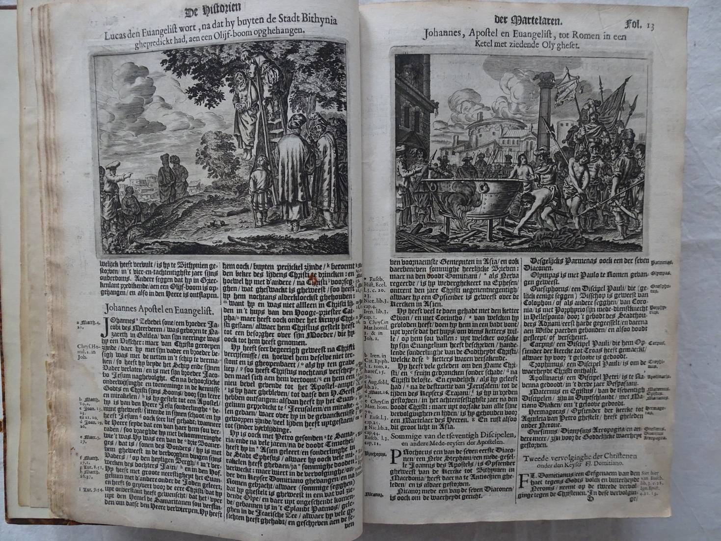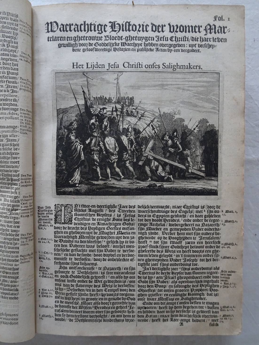 Amsterdam, 1658; Gerrit Willemsz. Doornick. Later halfleer met gemarmerde kartonnen platten; Rug goudbedrukt; klein folio (ca. 30 x 21 cm. Met ca.150 kopergravures (ca. 10x14 cm) en één bladvullende gravure ("Vertoning van de hovaerdy en hoogmoet der Pausen"). Titel en titelprent ontbreken. Boek begint met "Vermaninge tot de Overheydt"; (10), 483, 10 bladen (= samen 1006 pagina's).