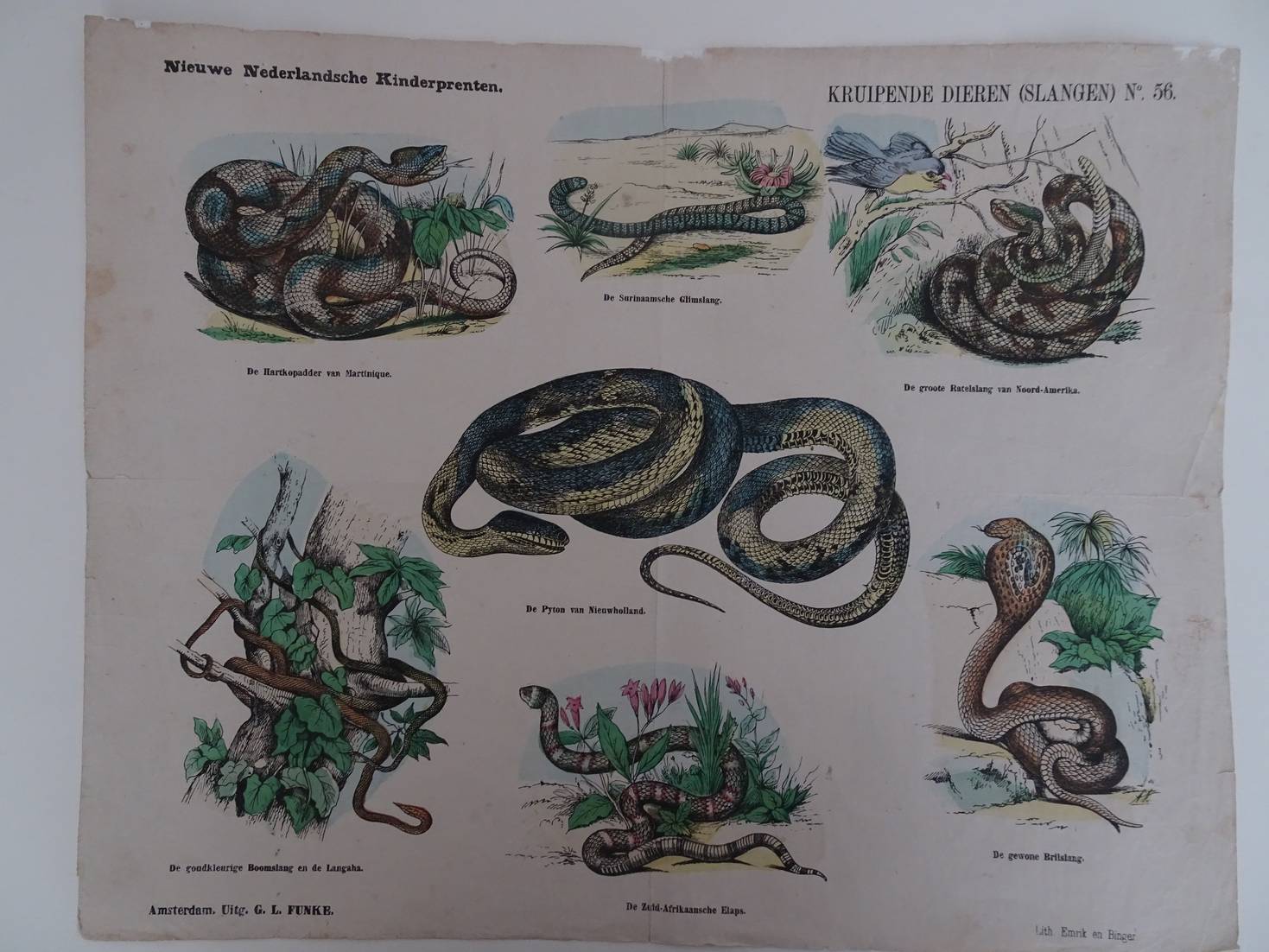 Amsterdam; ca. 1890; G.L. Funke. Litho, handgekleurd; Emrik en Binger. Met 7 afbeeldingen van slangen: De Hartkopaddervan Martinique, De Surinaamsche Glimslang, De Groote Ratelslang v. Noord-Amerika, de goudkleurige Boomslang en de Langaha, de Pyton van Nieuwholland, De Zuid-Afrikaansche Elaps en De gewone Brilslang. Afmeting 43,5 x 324,5 cm.