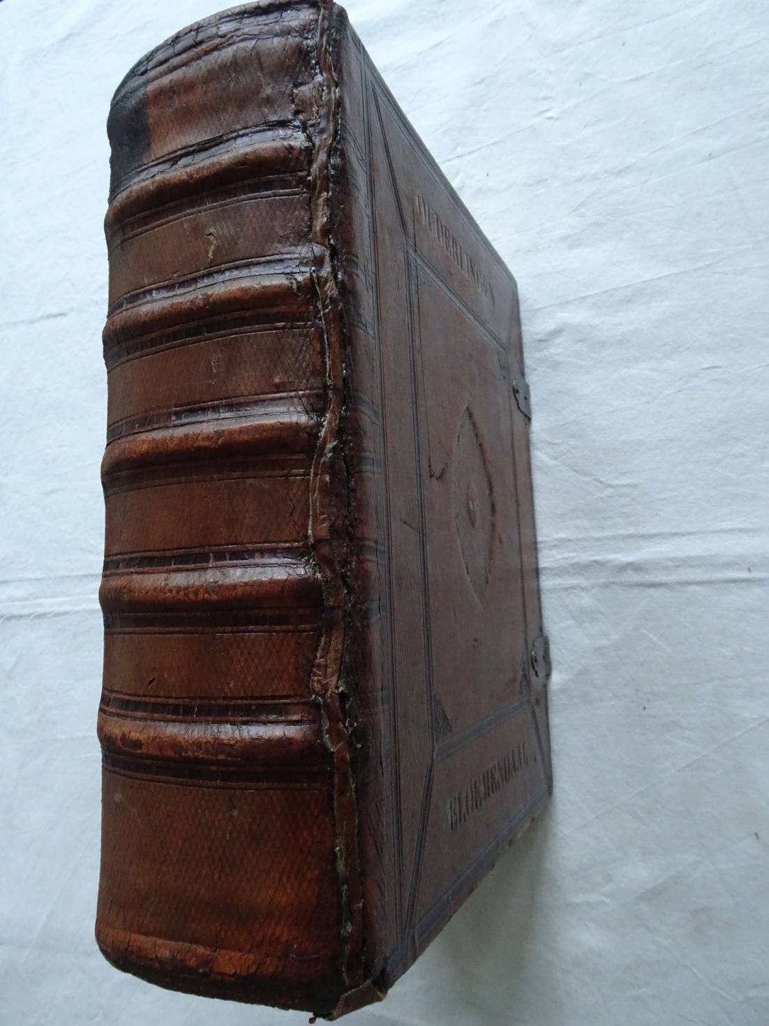 Antverpiae;1765; Ex Architypographia Plantiniana. Folio 37 x 24 cm. Title with copperengraving; printed in red and black; (68), 624, CXXVIII, (4), 8, (24) pp. and 45 pp additions from the 19th century. With 8 full page copper engraved plates and numerous woodcut ornamental initials. Binding; contemporary full red morocco, both sides with gilt printed floral ornaments; spine with raised bands and gilt ornaments.; edges gilt, marbled endpapers. Bindind with 4 nice copper corner pieces with floral ornaments and two decorated copper clasps. Front and back side have both religious representations in copper.