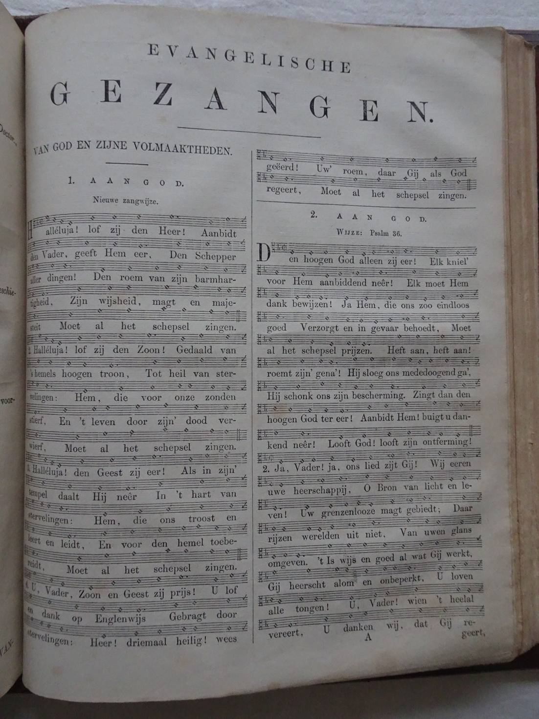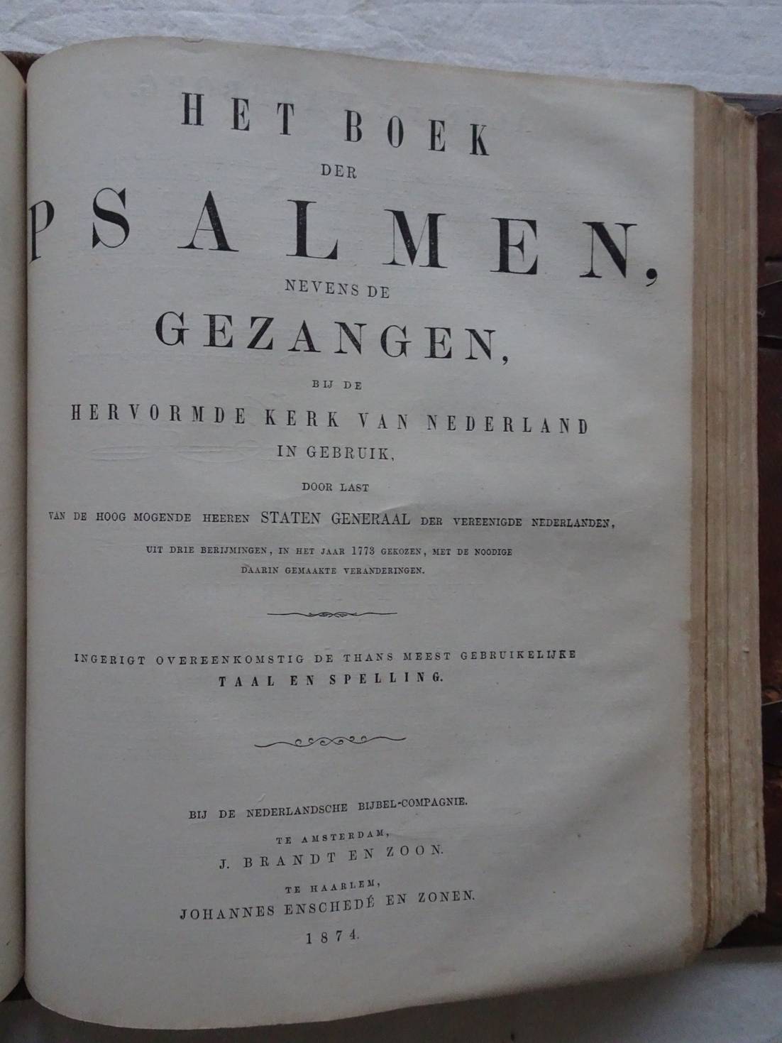 Amsterdam/ Haarlem; 1886; Nederlandsche Bijbel-Compagnie/ J. Brandt en Zoon/ Johannes Enschedé en Zonen; gebonden in lederen band met sluiting; goud op snee; 7,5x 10 cm.; 592, 311 (Boek der Psalmen), 288 (Evangelische Gezangen), 112 (Vervolgbundel op de Evangelische Gezangen) & 53 (Cathechismus) p.