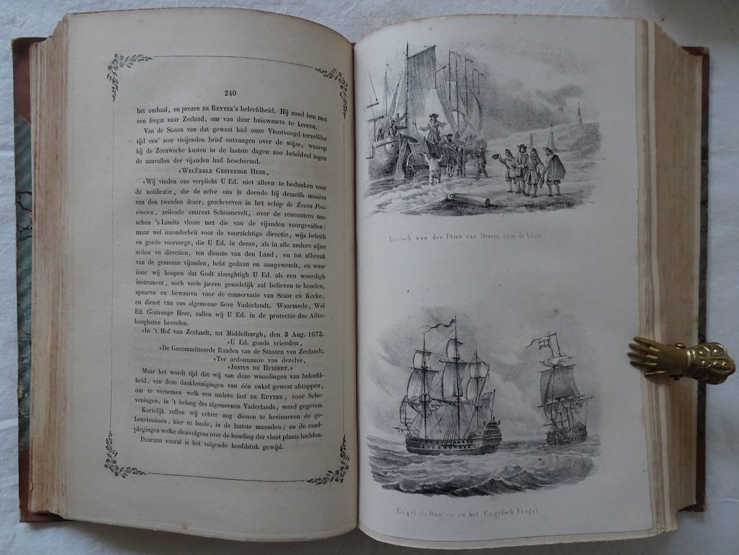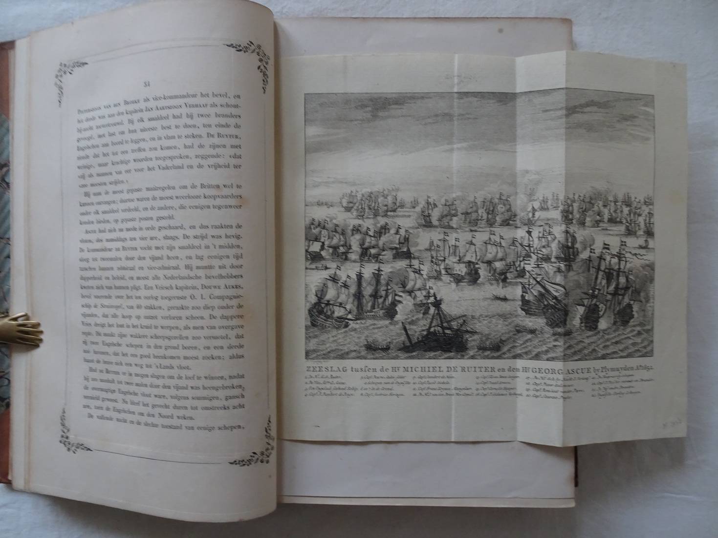 's-Gravenhage; 1844, 1848; A.P. van Langenhuysen; halfleather with marbled boards; leather gilt printed and blind tooled; illustrated with lithographs; woodengravings with the text; grangerized copy; additional 14 copperengravings (ca. 1800): " M.A. de Ruiter, Luitenant Admiraal", "Zeeslag tussen de Hr. Michiel de Ruiter en den Hr. Georg Ascue by Plymuyden", "De stad Nyborg veroverd door de Hr. Michiel de Ruiter en 't slaen der Zweeden door de Deenen", "Terres de Serbora", "Veue de l'entrée de la baye de Sierra Leone", "Vue de la Côte depuis Mina jusqu'au Maure, tirée de Barbot et de Smith: a canots negres de Manfro qui conduisent des esclaves a bord", "De beide oude vrienden herkenden malkander dadelijk", "Willem III ontvangt de Ruiter aan den Uithoorn", "Afbeelding van de stad en rivier van Rochester, Chattam waar in vertoond werd de victorieuse uitwerkinge van 's Lands oorlogs vloot onder 't beleid van den Hr. Admiraal Michiel de Ruiter", 3 different copperengravings of ships, "Zee slag tusschen de Hr. Adml. M. de Ruiter, den Prins Robbert en Graaf de Estrée by Kykdn." & "Zee slag van den Hr. Admiraal Michiel de Ruiter en den Hr. de la Zarda, tegens de Fransche Adl. de Hr. du Quesne, by het eiland Sicilien omtrent den berg Etna"; [15], XX , 480 en resp. [VII], 747 p.