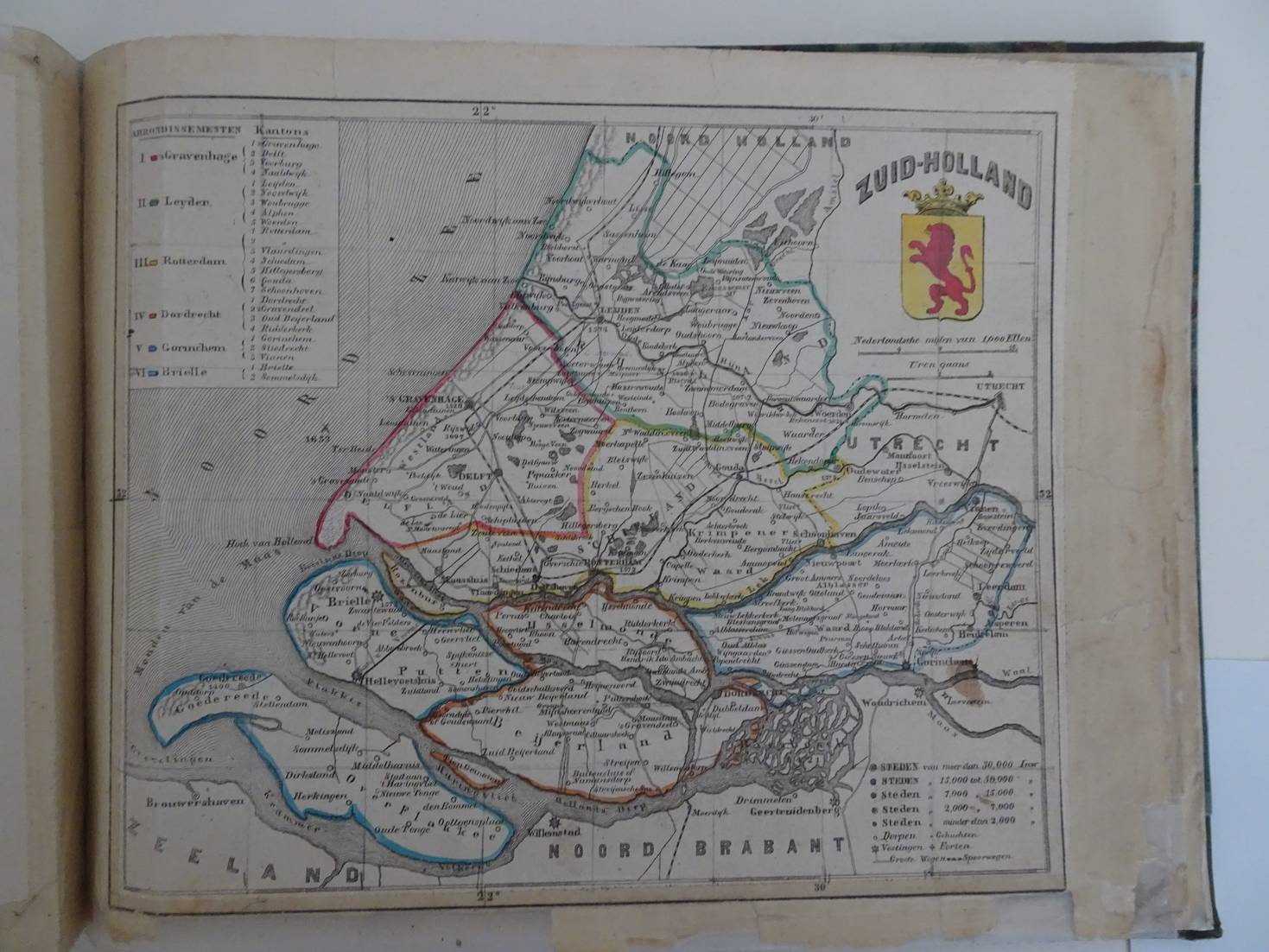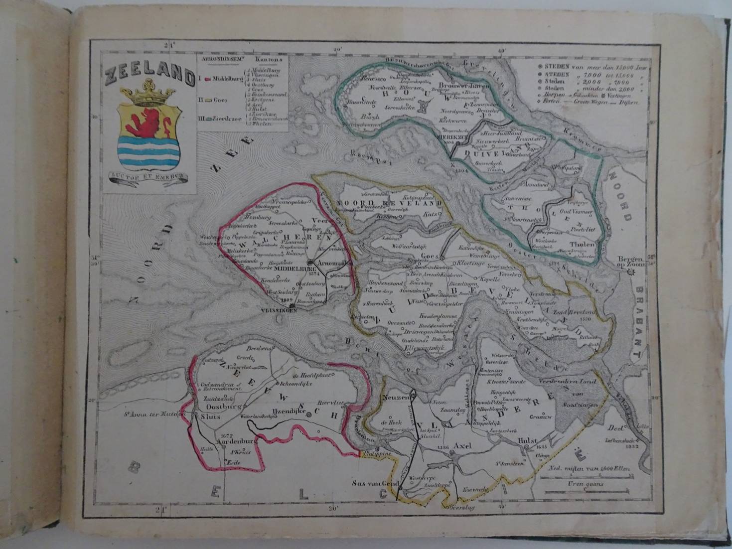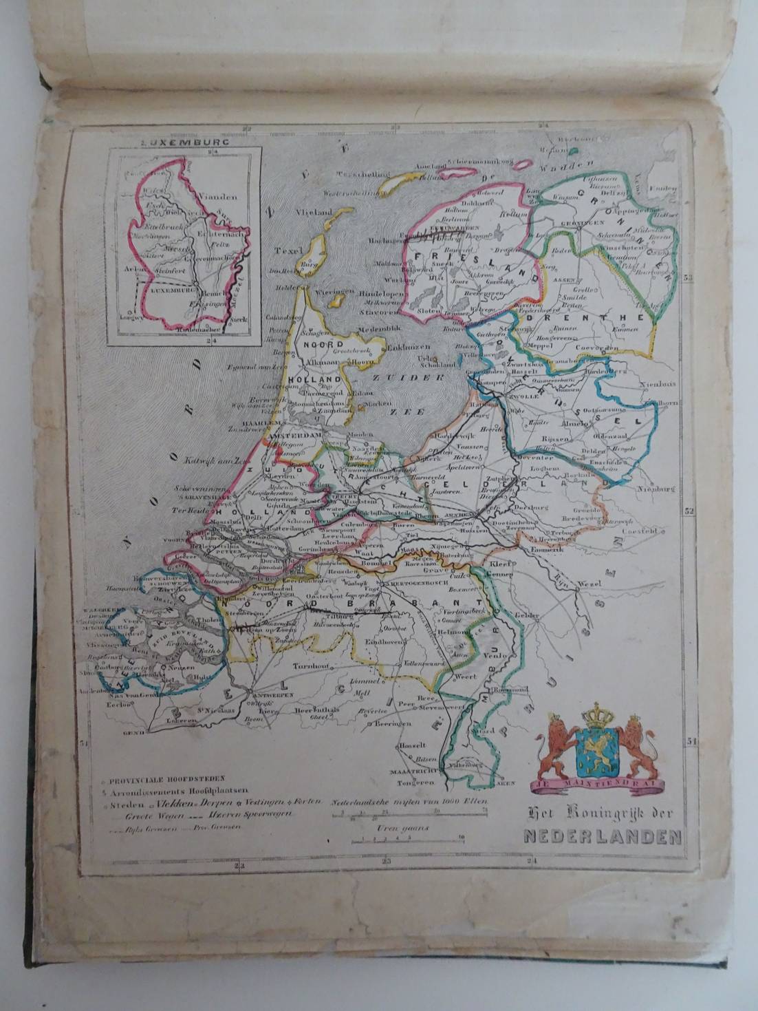 Amsterdam; zonder datum (ca. 1860); A. Braakensiek. Tweede druk. Titelpagina met 13 handgekleurde wapens en met 14 gelithografeerde, handgekleurde kaarten: De 11 provincies, Nederland (+ Luxemburg in kader), Het Groot Hertogdom Luxemburg, en Nederlandsche Overzeesche Bezittingen. Later halfleer met gemarmerde platten. Afmeting:21,5 x 17 cm.