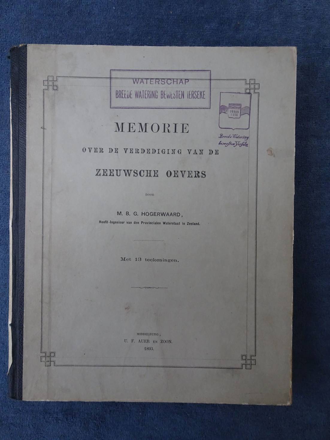 Middelburg; 1893; U.F. Auer en Zoon; halflinnen; 13 uitslaande, gegraveerde platen; o.a. van de Hoofdplaat-polder, Vliete Polder, Anna Friso Polder, duinen, dijken, toestand van Zeeland in 1200, profielen van onderzees verdedigde oevers, strandhoofden, etc.; 73 p. + platen.