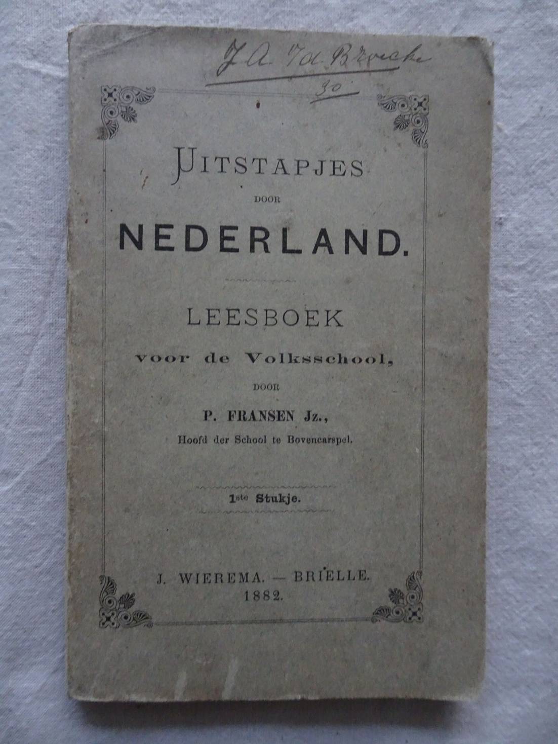 Voorplat wat vlekkig. Achterplat met kleine beschadiging. Hoekjes van de band sleets. Naam op titelblad. Inscriptie op blanco schutblad.