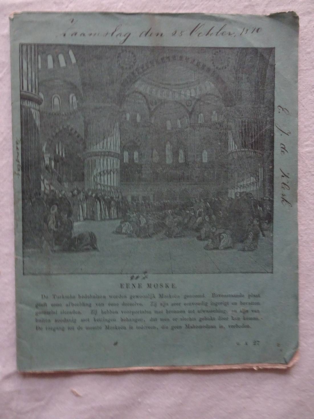 Amsterdam; 1798; Johannes van der Hey. Complete ingebonden jaargang met 53 afleveringen. Iedere aflevering heeft een bepaald thema zoals vulkanen ("vuurbergen") , "Rivieren" en "De Bloemhof" en begint steeds met een gravure. Gekartonneerd; met recent handgemarmerd papier; 424 p.