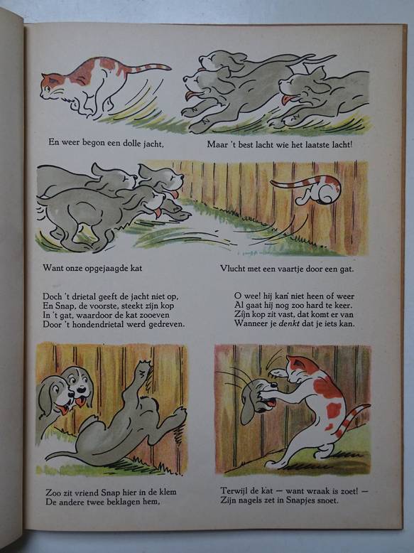 Zonder plaats; zonder jaar; zachte kaft; ca. 21x33 cm.; paginagrote ill. in kleur met beweegbare onderdelen, bij versjes op rijm; ongepagineerd.