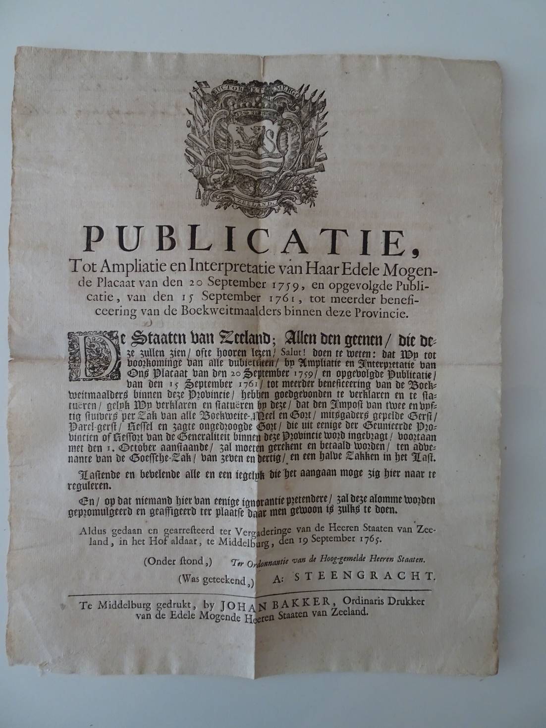 Publicatie, Tot Ampliatie en Interpretatie van Haar Edele Mogende Placaat van den 20 September 1759, en opgevolgde Publicatie, van den 15 September 1761, tot meerder beneficeering van de Boekweitmaalders binnen deze Provincie.