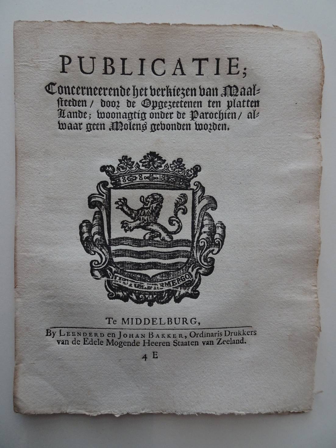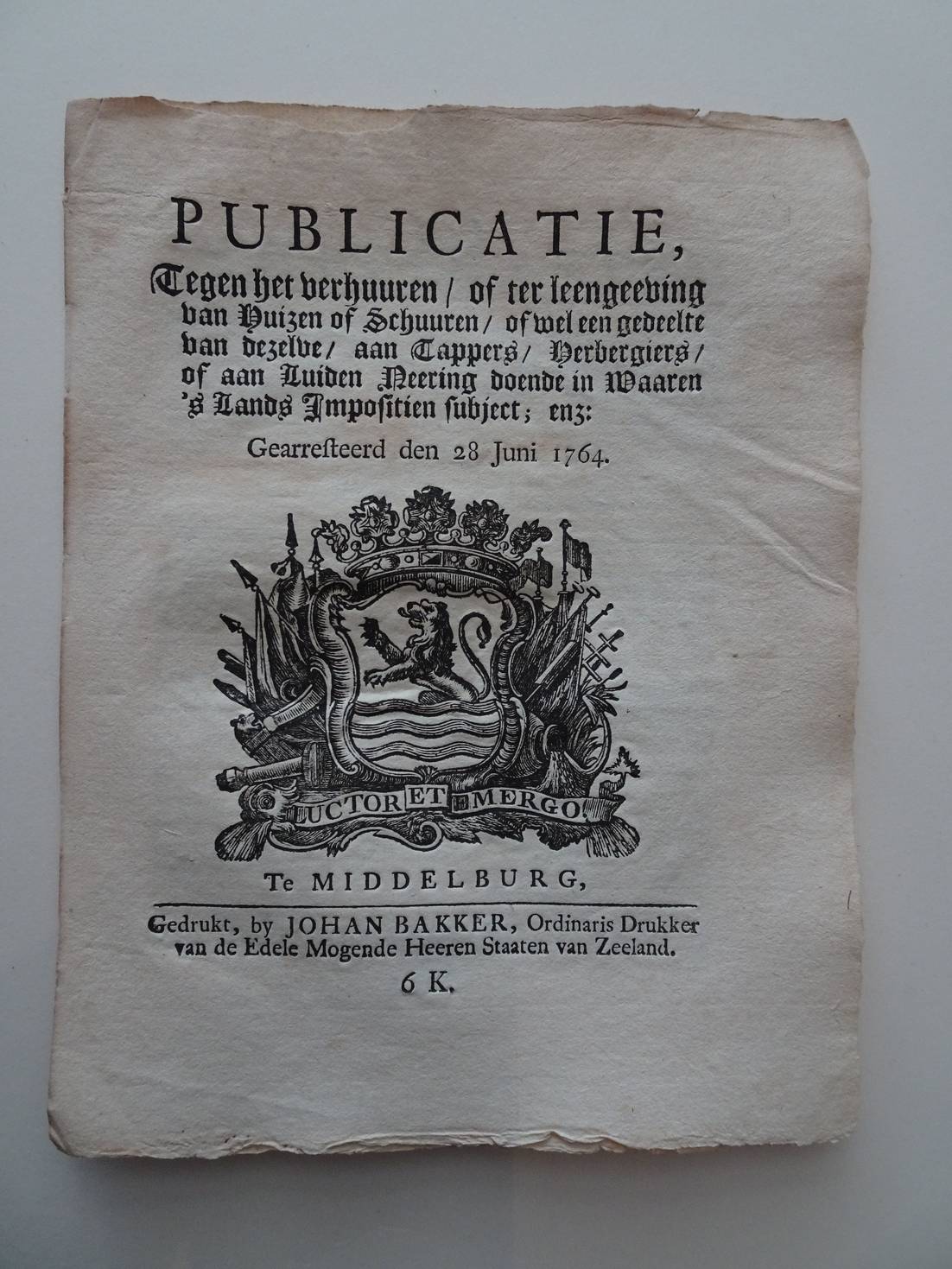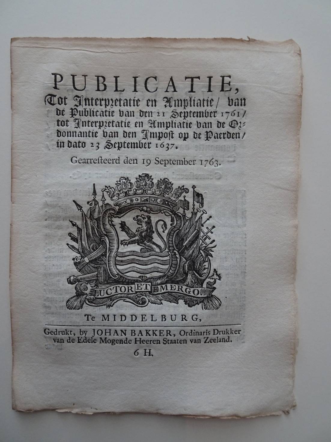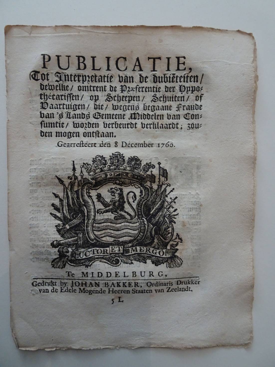 In plano. [1386]Publicatie, Tot Interpretatie van de dubiëteiten/ dewelke/ omtrent de Præferentie der Hypothécarissen/ op Scheepen/ Schuiten/ of Vaartuigen/ die/ wegens begaane Fraude van 's Lands Gemeene Middelen van Consumtie/ worden verbeurdt verklaardt; zouden mogen ontstaan. Gearresteert den 8 December 1760. Middelburg; 1760; Johan Bakker; 4 p. [1476]