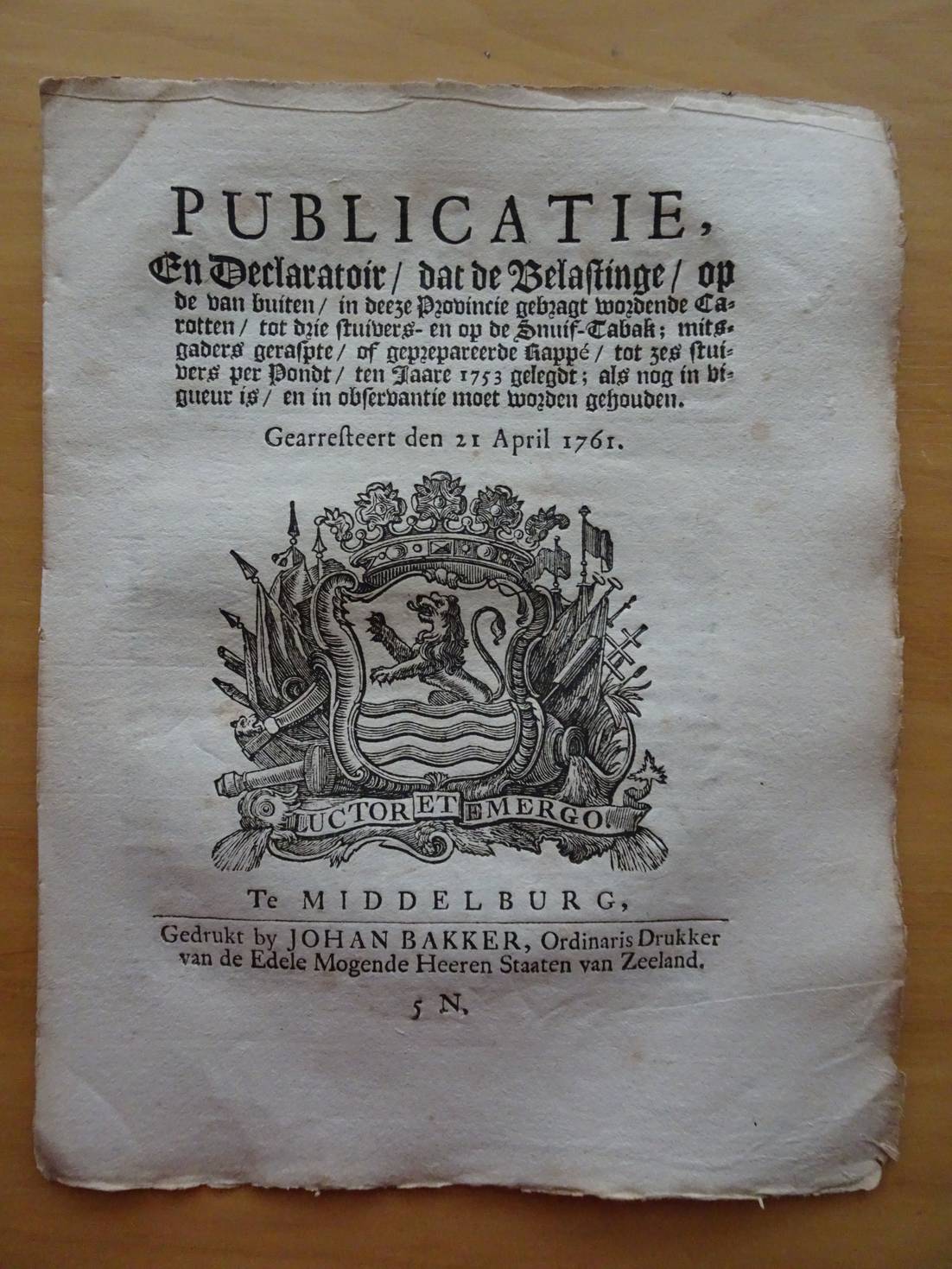 [23680]Publicatie, En Declaratoir/ dat de Belastinge/ op de van buiten/ in deeze Provincie gebragt wordende Carotten/ tot drie stuivers- en op de Snuif-Tabak; mitsgaders geraspte/ of geprepareerde Rappé/ tot zes stuivers per Pondt/ ten Jaare 1753 gelegd; als nog in vigueur is/ en in observantie moet worden gehouden. Gearresteert den 21 April 1761. Middelburg; 1761; Johan Bakker; 4 p. [1415]