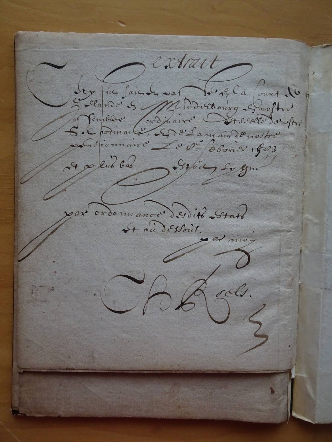 Middelburgh; 1583; Richard Schilders, Drucker der Staten van Zeelandt. Titelblad met wapen van Zeeland. Later halflinnen met gemarmerde platten; 8 p. Vervolgens dezelfde tekst in het Frans vertaald in 16e-eeuws handschrift; 8p.