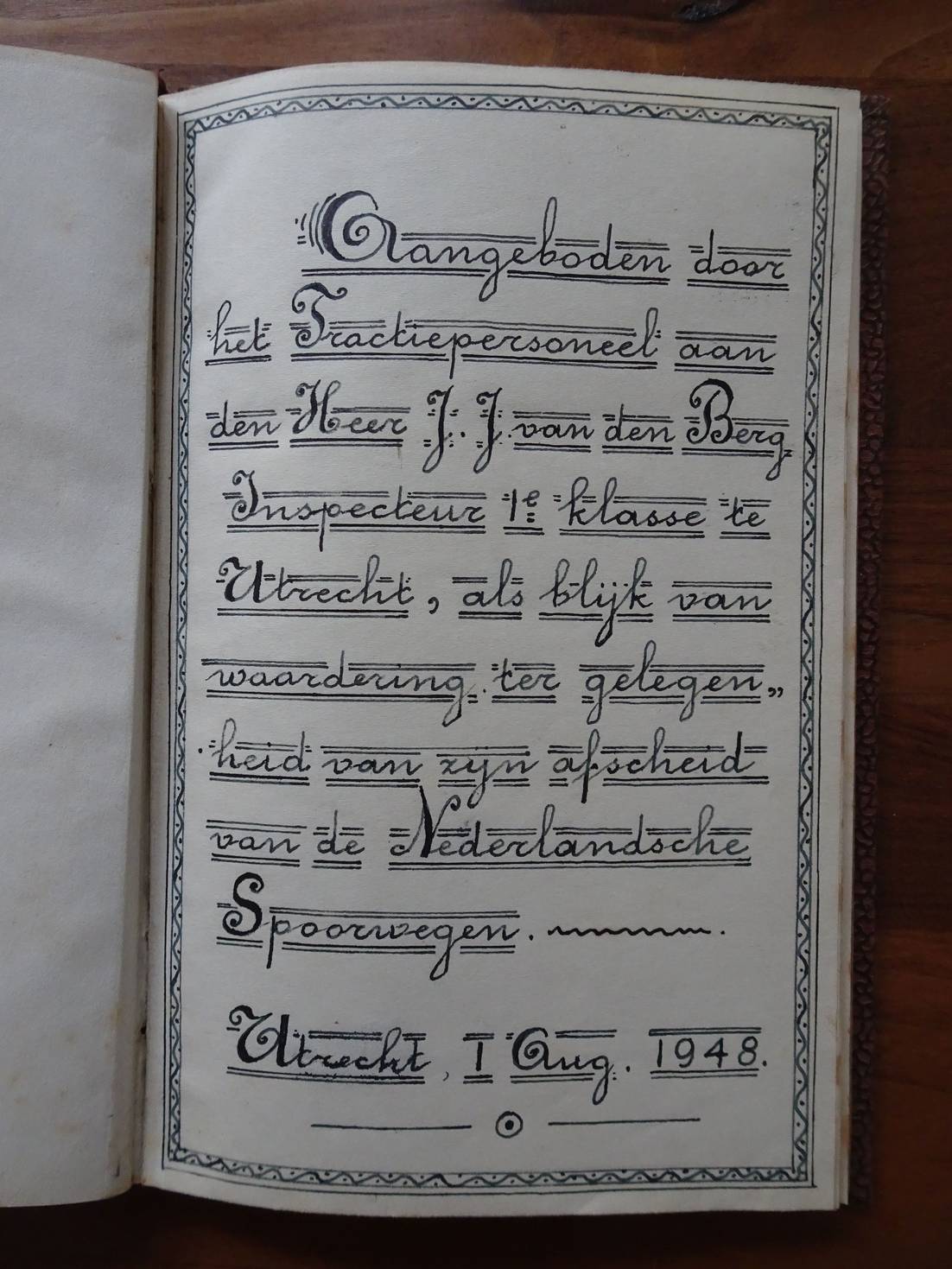 Aangeboden door het Tractiepersoneel aan den heer J.J. van den Berg, Inspecteur 1e klasse te Utrecht, als blijk van waardering ter gelegenheid van zijn afscheid van de Nederlandsche Spoorwegen, Utrecht, 1 Aug. 1948.