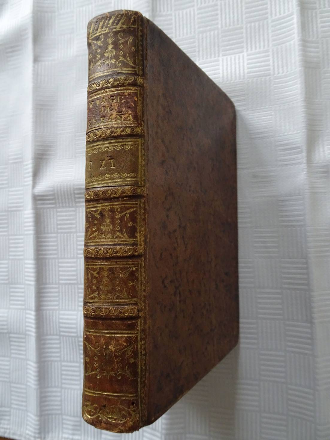 Omslag beduimeld en gevlekt. Voorplat beschreven. Slijtagesporen, met name langs en aan de rug. Naam vorige eigenaar op franse titelpagina.