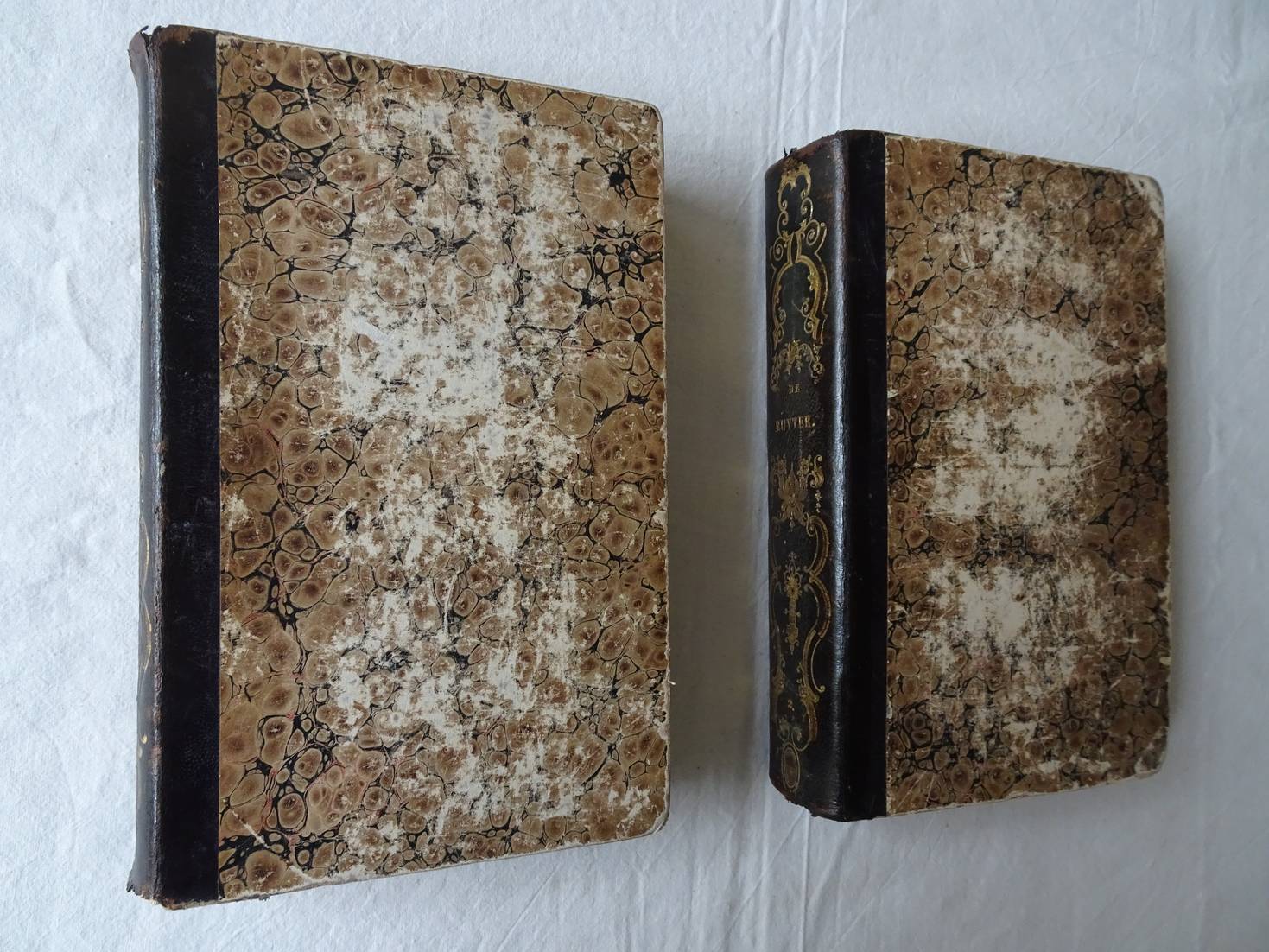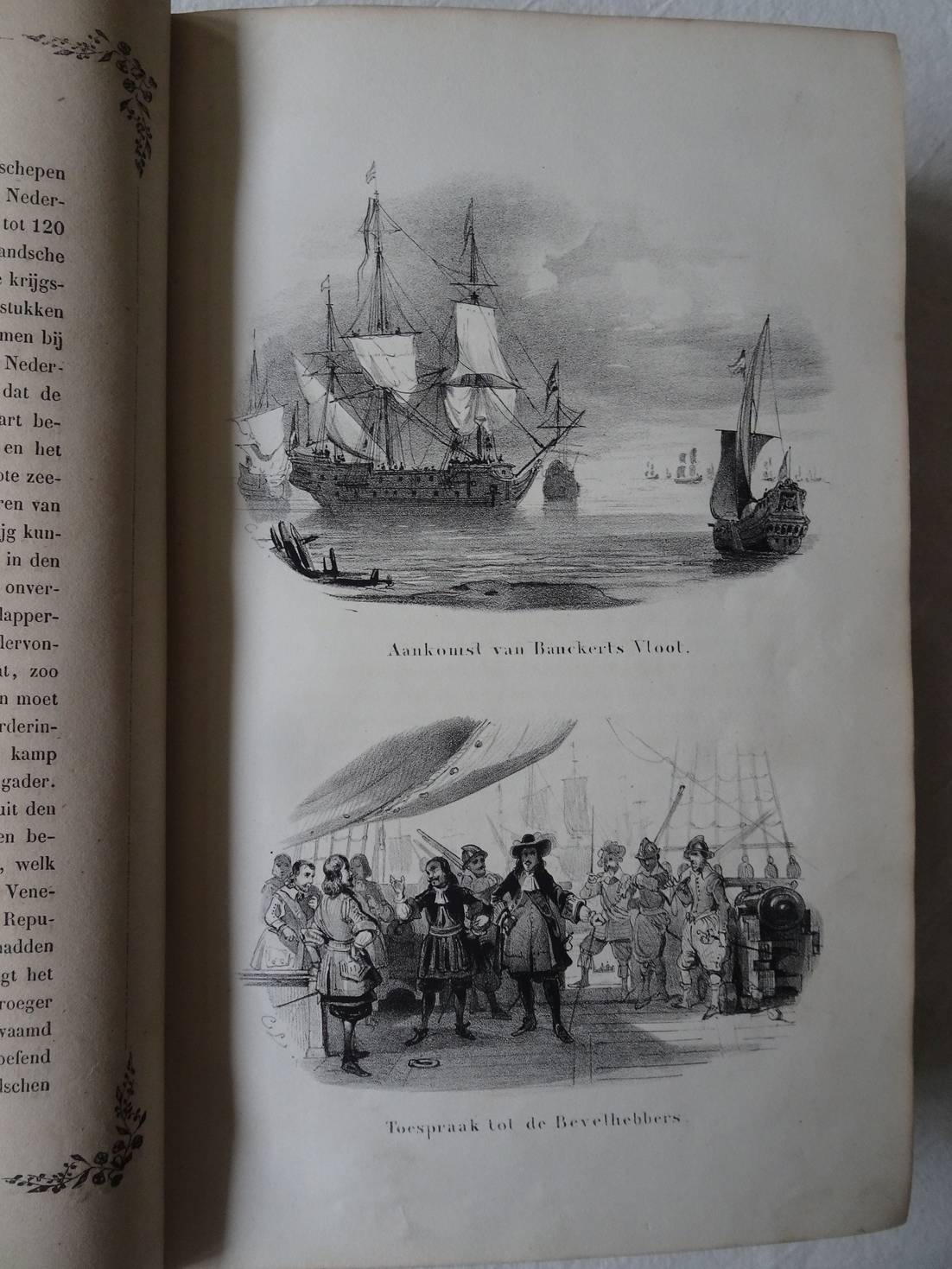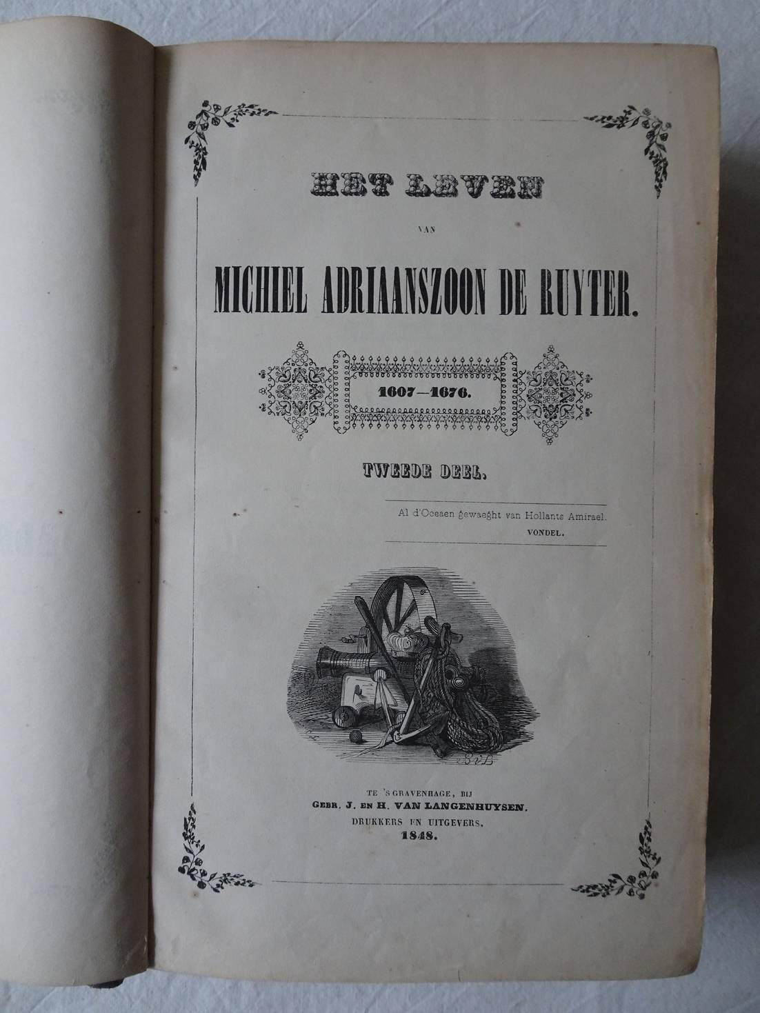 's-Gravenhage; 1844, 1848; A.P. van Langenhuysen; halfleather with marbled boards; leather gilt printed and blind tooled; illustrated with lithographs; woodengravings with the text; grangerized copy; additional 14 copperengravings (ca. 1800): " M.A. de Ruiter, Luitenant Admiraal", "Zeeslag tussen de Hr. Michiel de Ruiter en den Hr. Georg Ascue by Plymuyden", "De stad Nyborg veroverd door de Hr. Michiel de Ruiter en 't slaen der Zweeden door de Deenen", "Terres de Serbora", "Veue de l'entrée de la baye de Sierra Leone", "Vue de la Côte depuis Mina jusqu'au Maure, tirée de Barbot et de Smith: a canots negres de Manfro qui conduisent des esclaves a bord", "De beide oude vrienden herkenden malkander dadelijk", "Willem III ontvangt de Ruiter aan den Uithoorn", "Afbeelding van de stad en rivier van Rochester, Chattam waar in vertoond werd de victorieuse uitwerkinge van 's Lands oorlogs vloot onder 't beleid van den Hr. Admiraal Michiel de Ruiter", 3 different copperengravings of ships, "Zee slag tusschen de Hr. Adml. M. de Ruiter, den Prins Robbert en Graaf de Estrée by Kykdn." & "Zee slag van den Hr. Admiraal Michiel de Ruiter en den Hr. de la Zarda, tegens de Fransche Adl. de Hr. du Quesne, by het eiland Sicilien omtrent den berg Etna"; [15], XX , 480 en resp. [VII], 747 p.